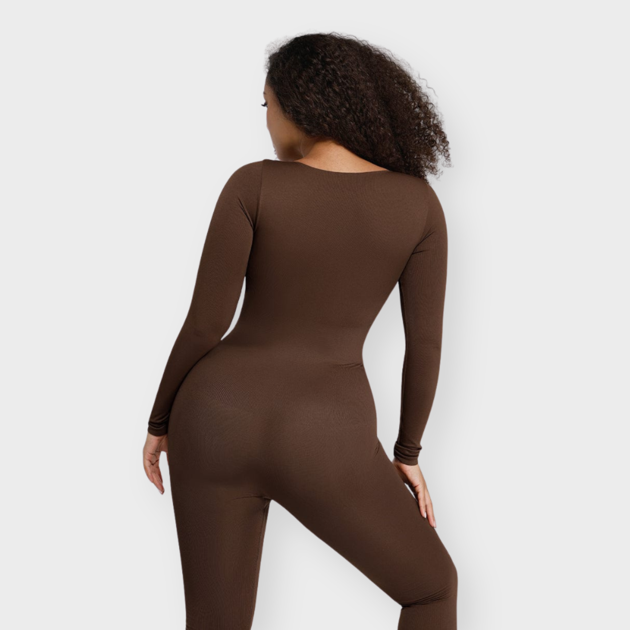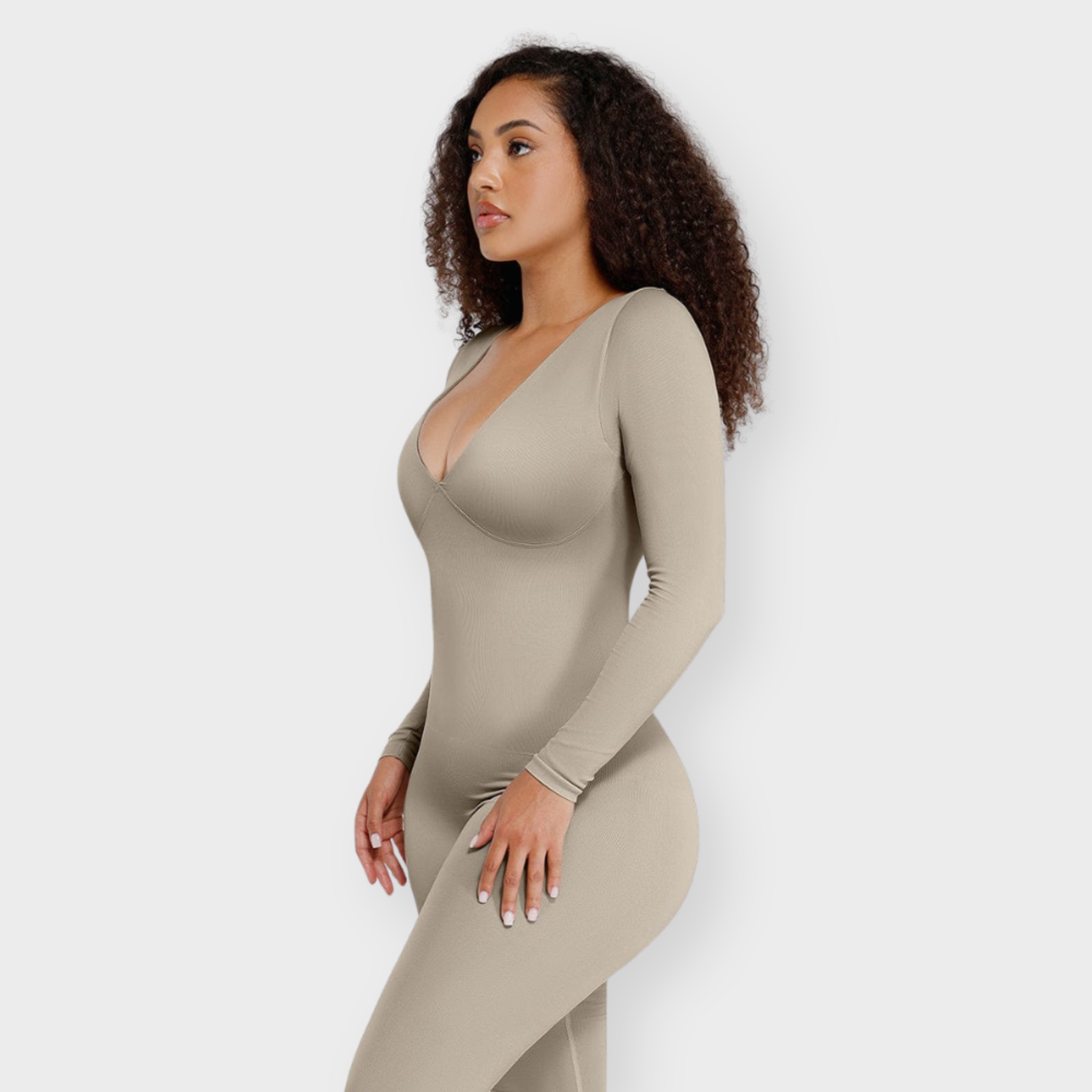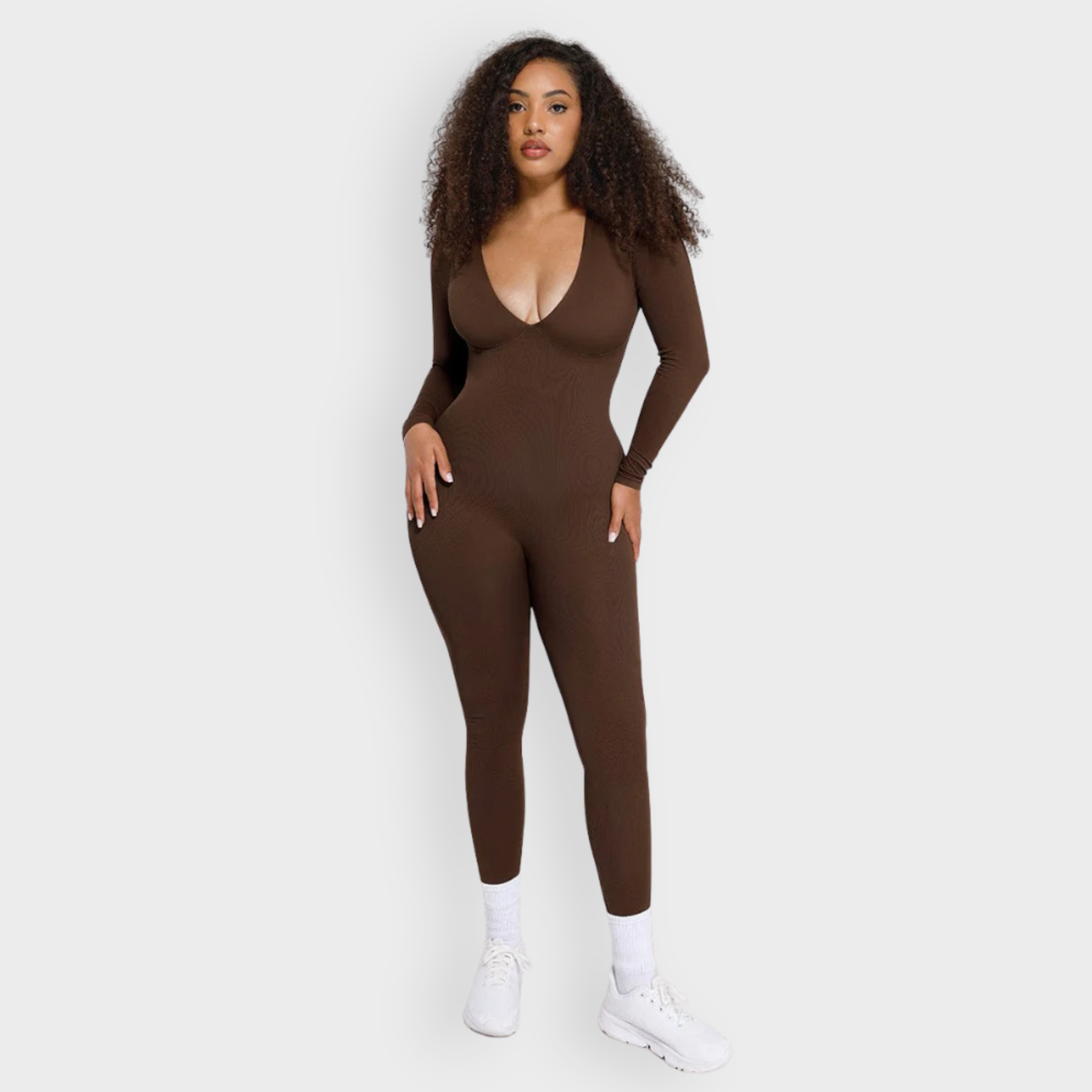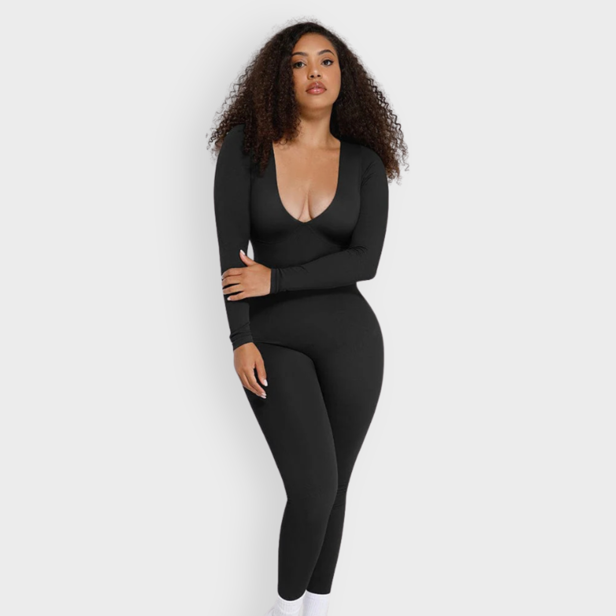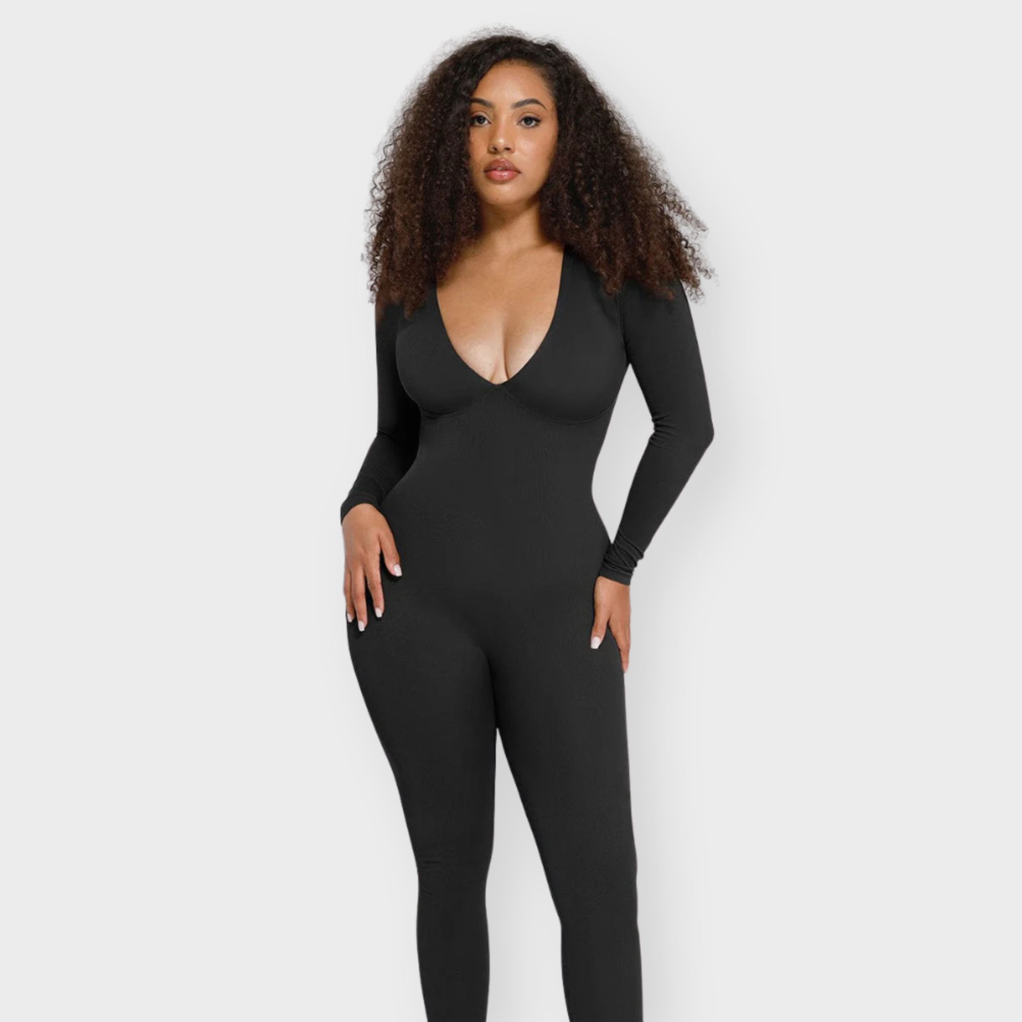 An effortlessly bold one-piece that delivers all-day contouring with zero compromise on comfort. This seamless catsuit features a plunging deep V neckline and a structured under-bust panel for natural lift and support. The double-layered chest with removable padded cups means you can skip the bra, while the tightly knit waist zone sculpts the tummy and defines your silhouette. Designed to move with you, this catsuit blends flexibility with powerful shaping to become your next second-skin staple.