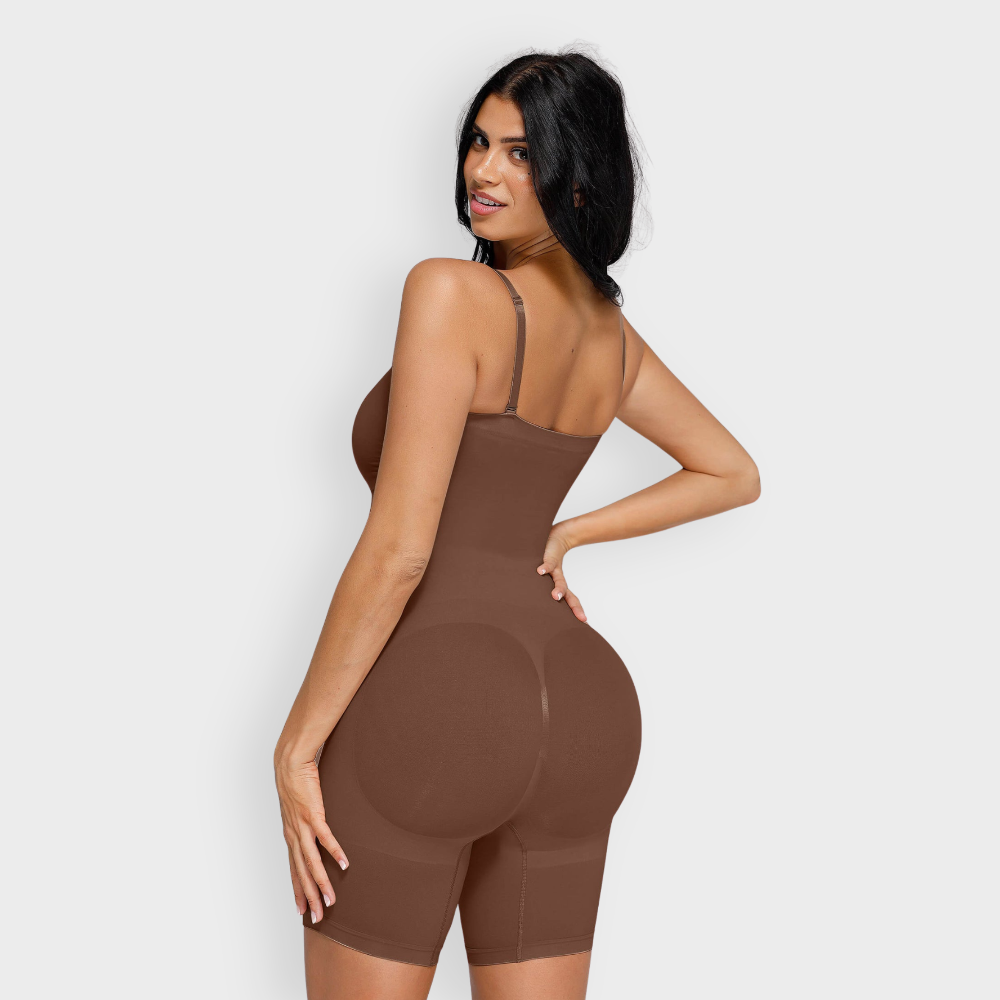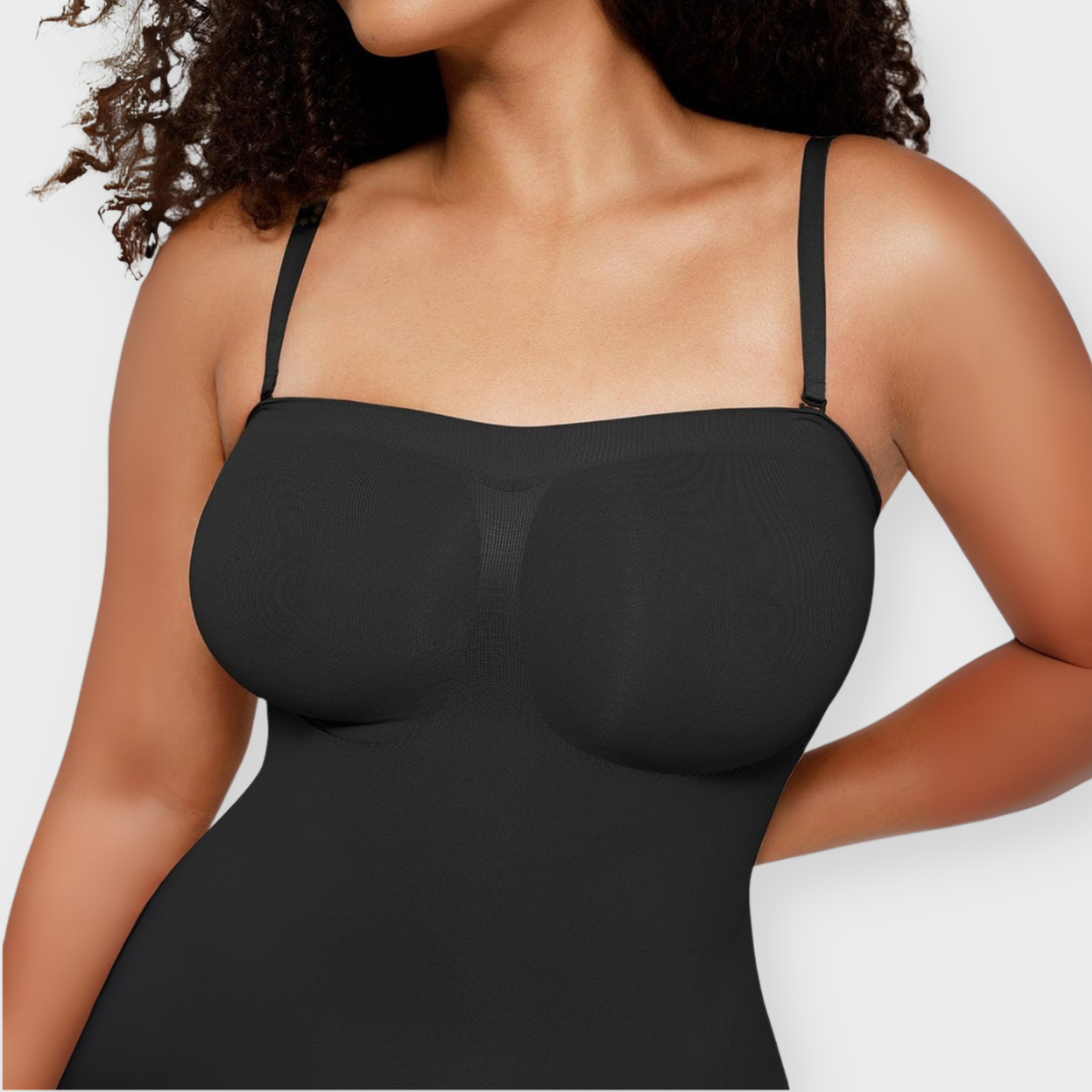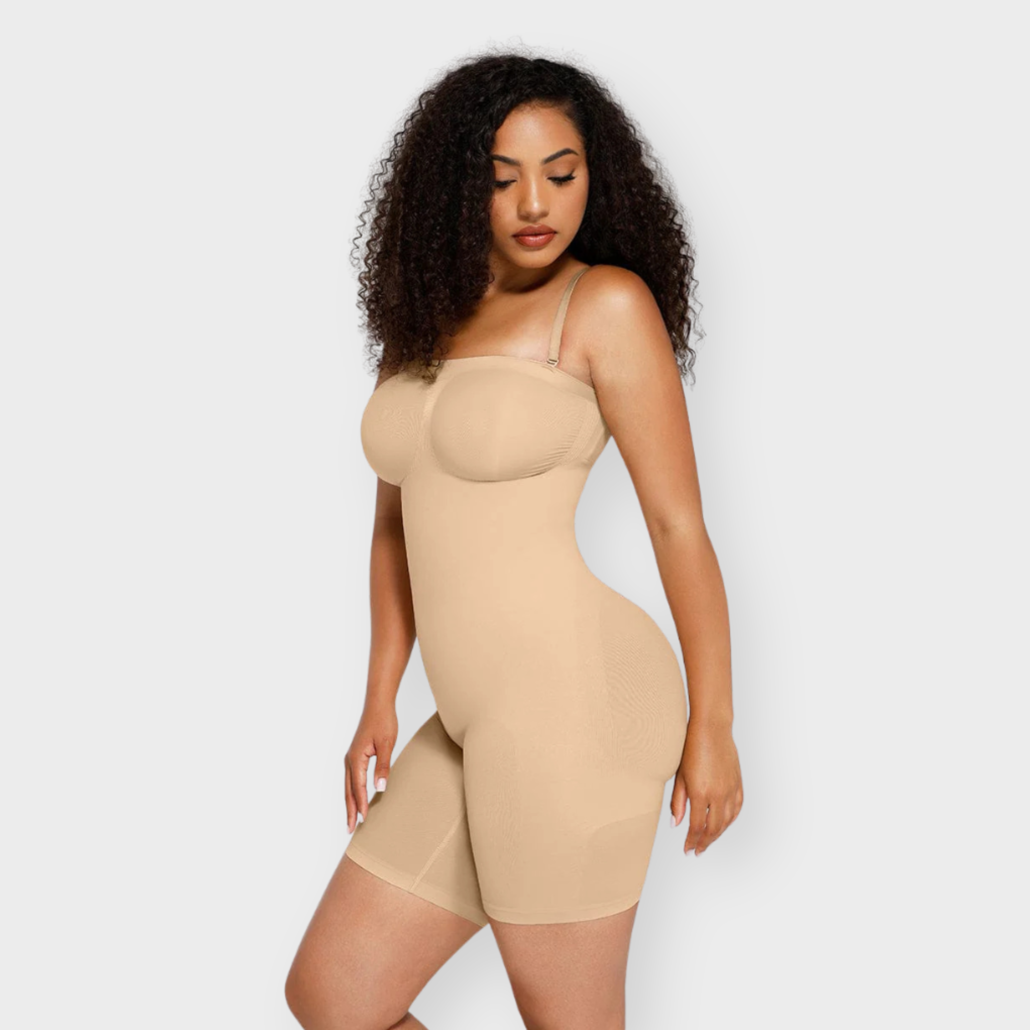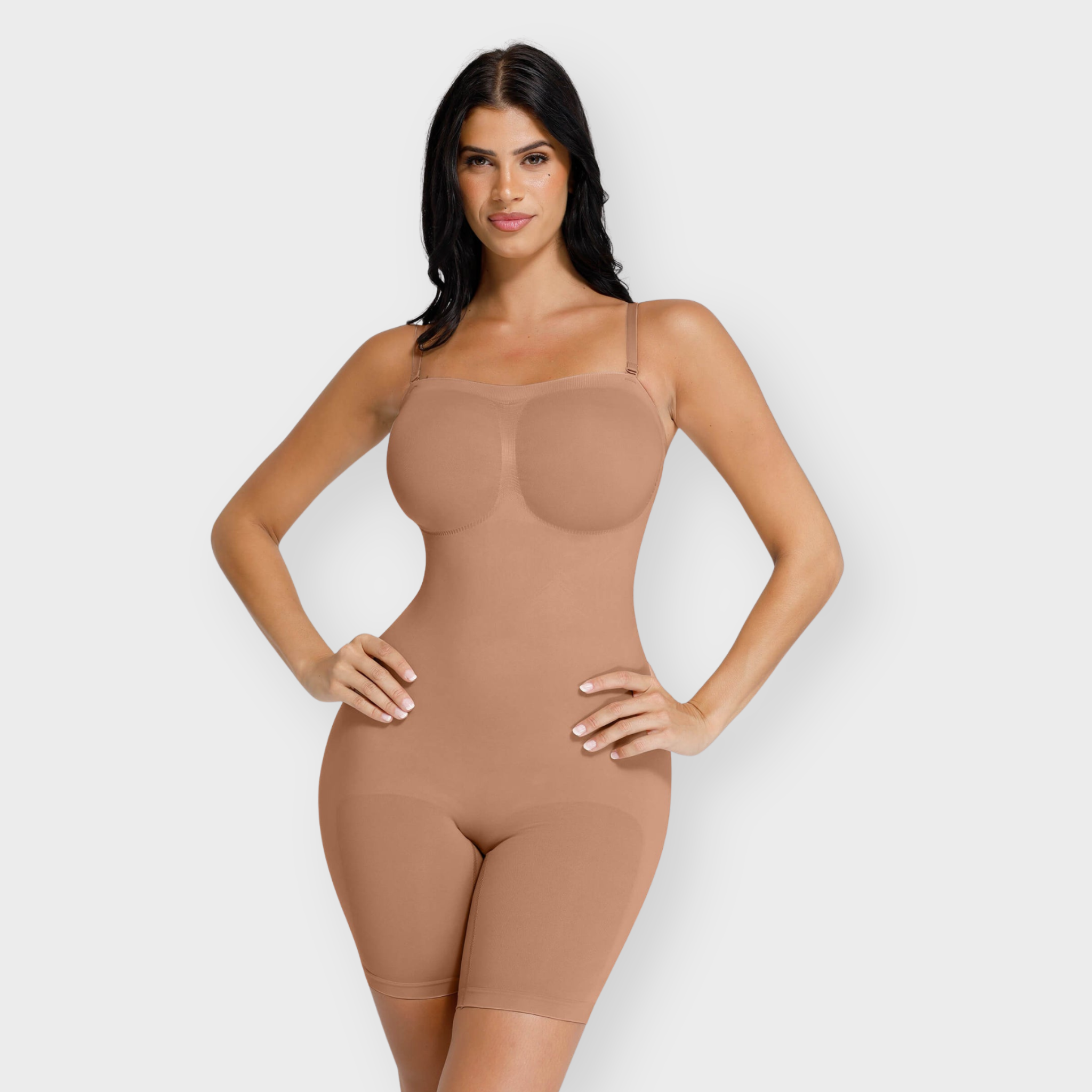 Designed to sculpt without compromise, this strapless shapewear bodysuit delivers breathable coverage and contouring where you need it most. Featuring built-in bust support, a tummy-smoothing midsection, and a butt-lifting back panel, it shapes and holds with seamless ease. Removable straps and anti-slip grip provide styling versatility and a secure fit for every look—strapless, halter, or cross-back. Finished with an overlapping crotch for easy bathroom access and discreet underarm boning for anti-roll comfort.
