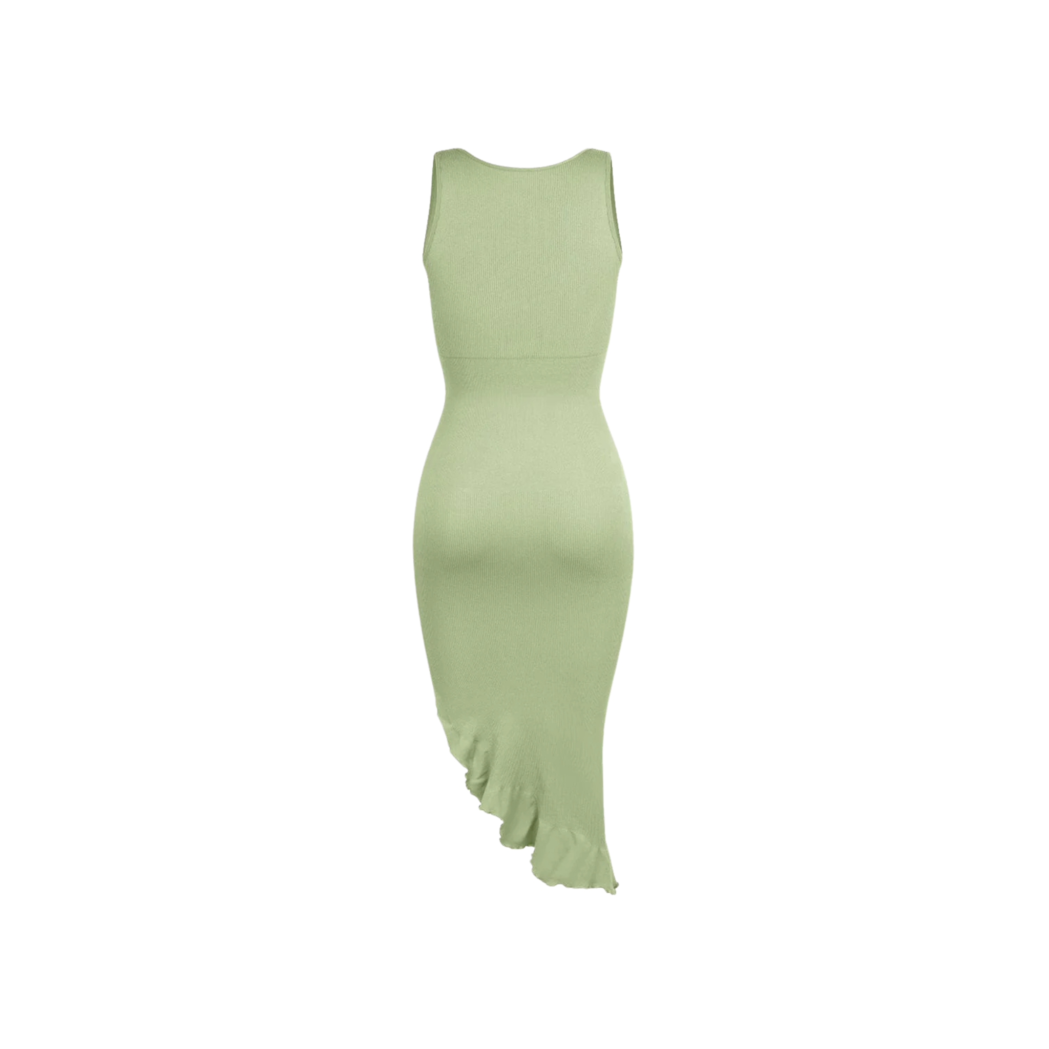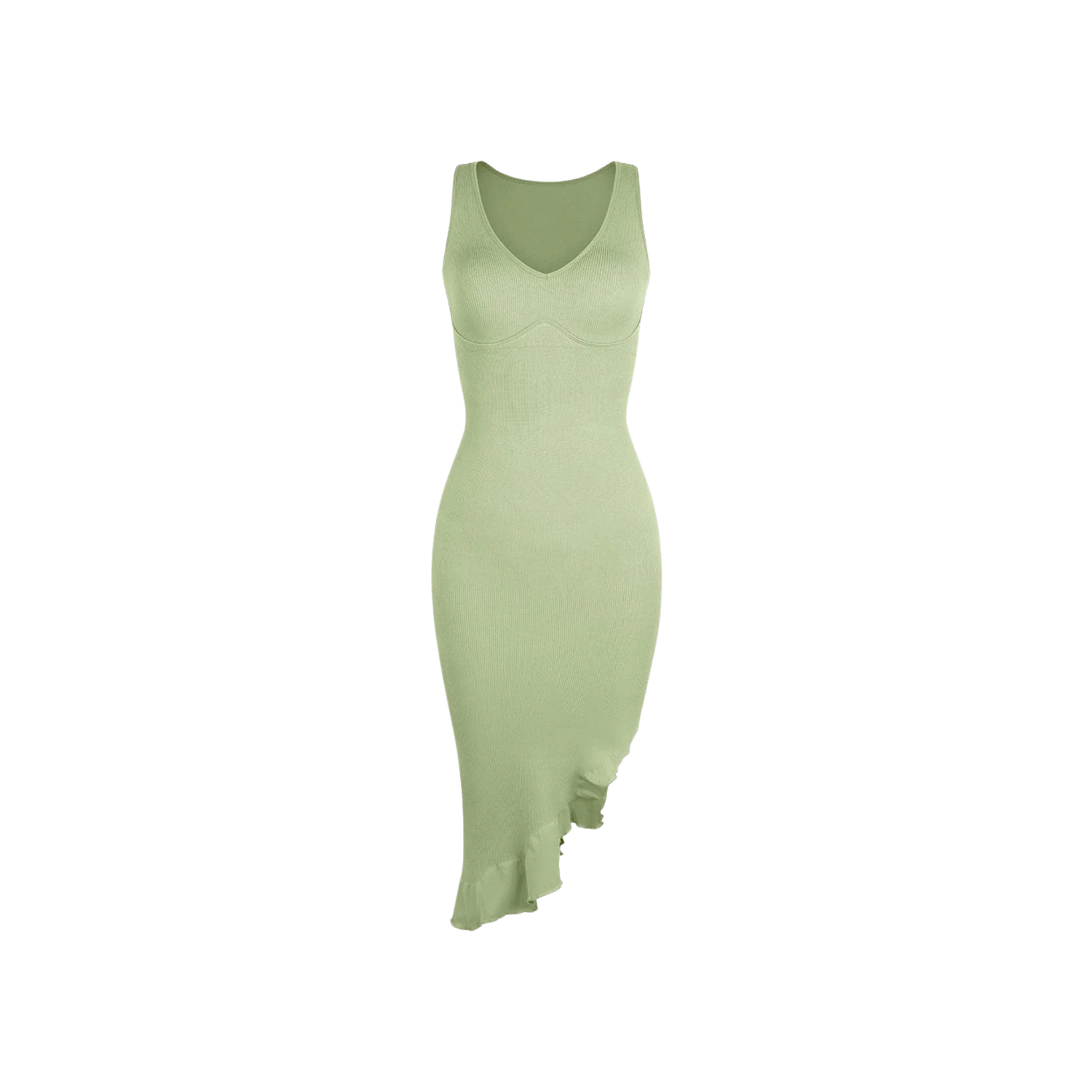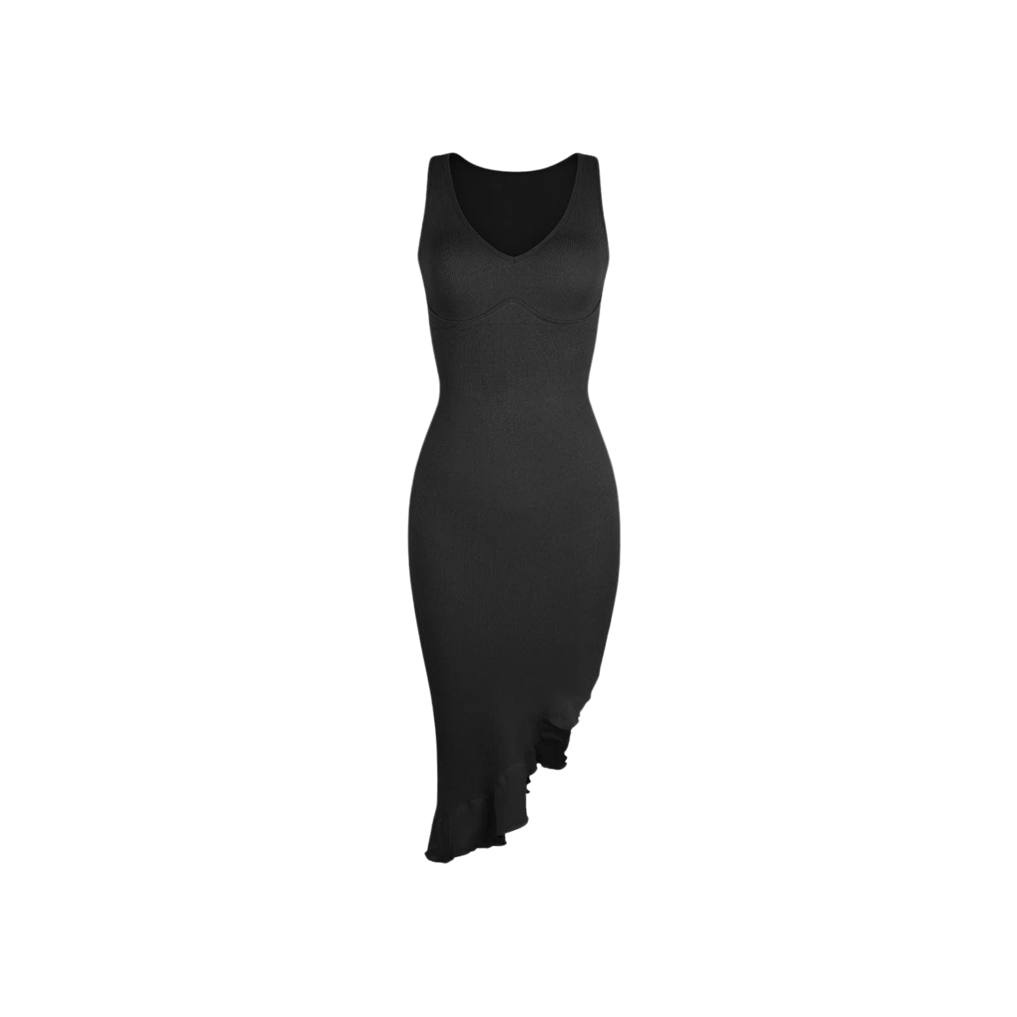 This Shaping Dress is designed to flatter your every curve while adding a romantic edge. Crafted with a deep V-neckline that draws attention to the collarbone and a high back that smooths and supports, this seamless one-piece delivers 360° waist and tummy compression without sacrificing comfort. Its asymmetrical ruffle hemline flows with grace, making it the perfect shapewear-meets-statement piece for parties, evenings out, or elevated everyday looks.