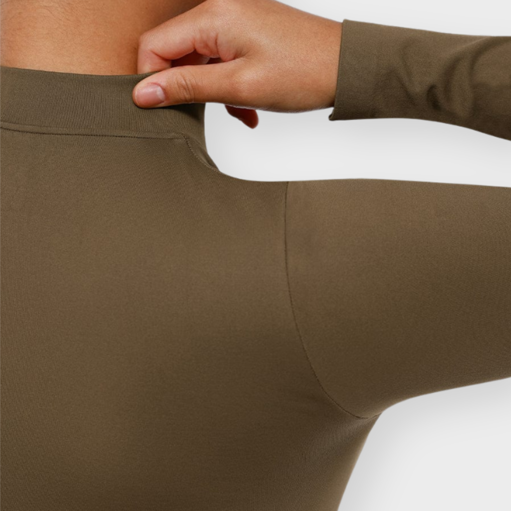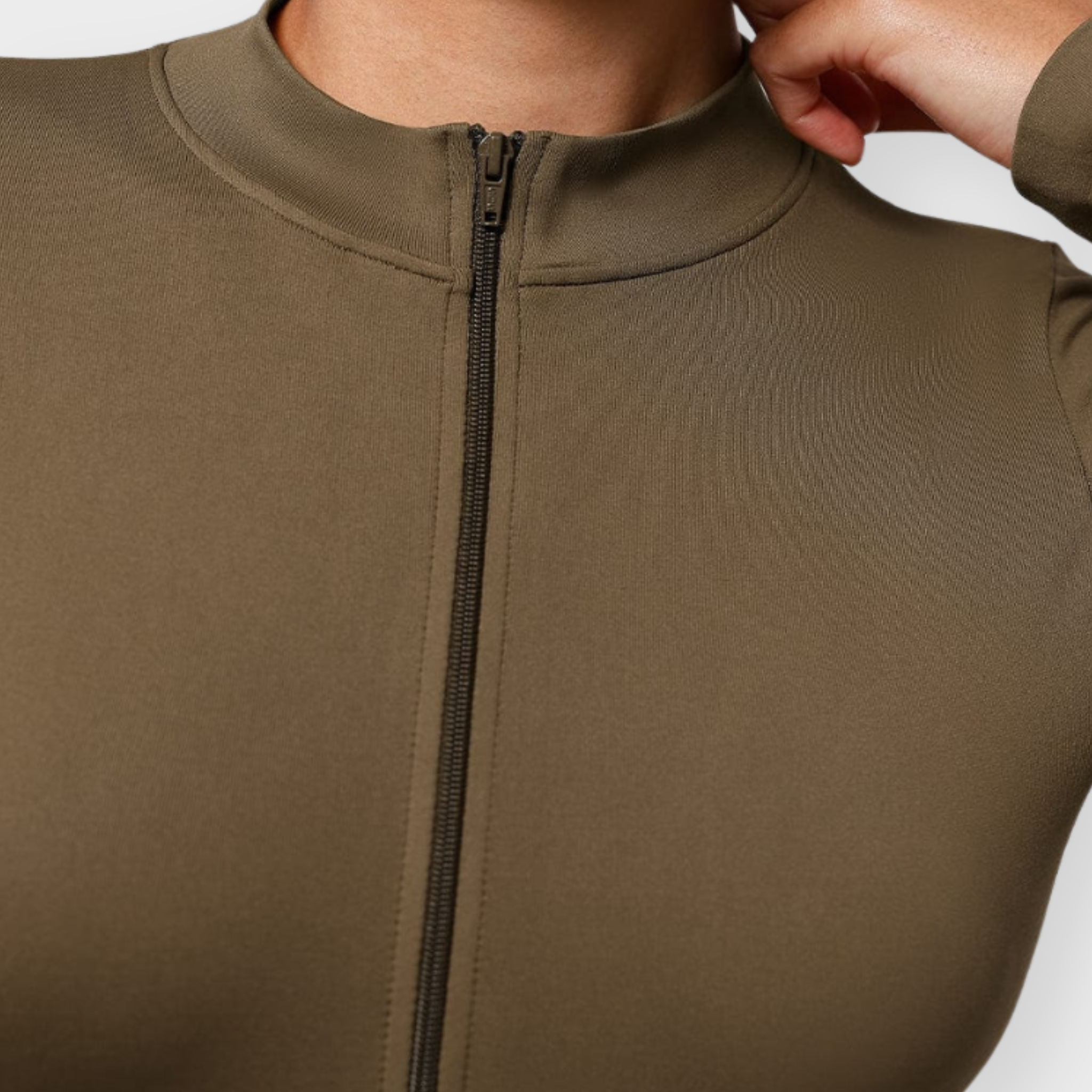 Zipper collar design offers both stand-up and plunging V-neck styles