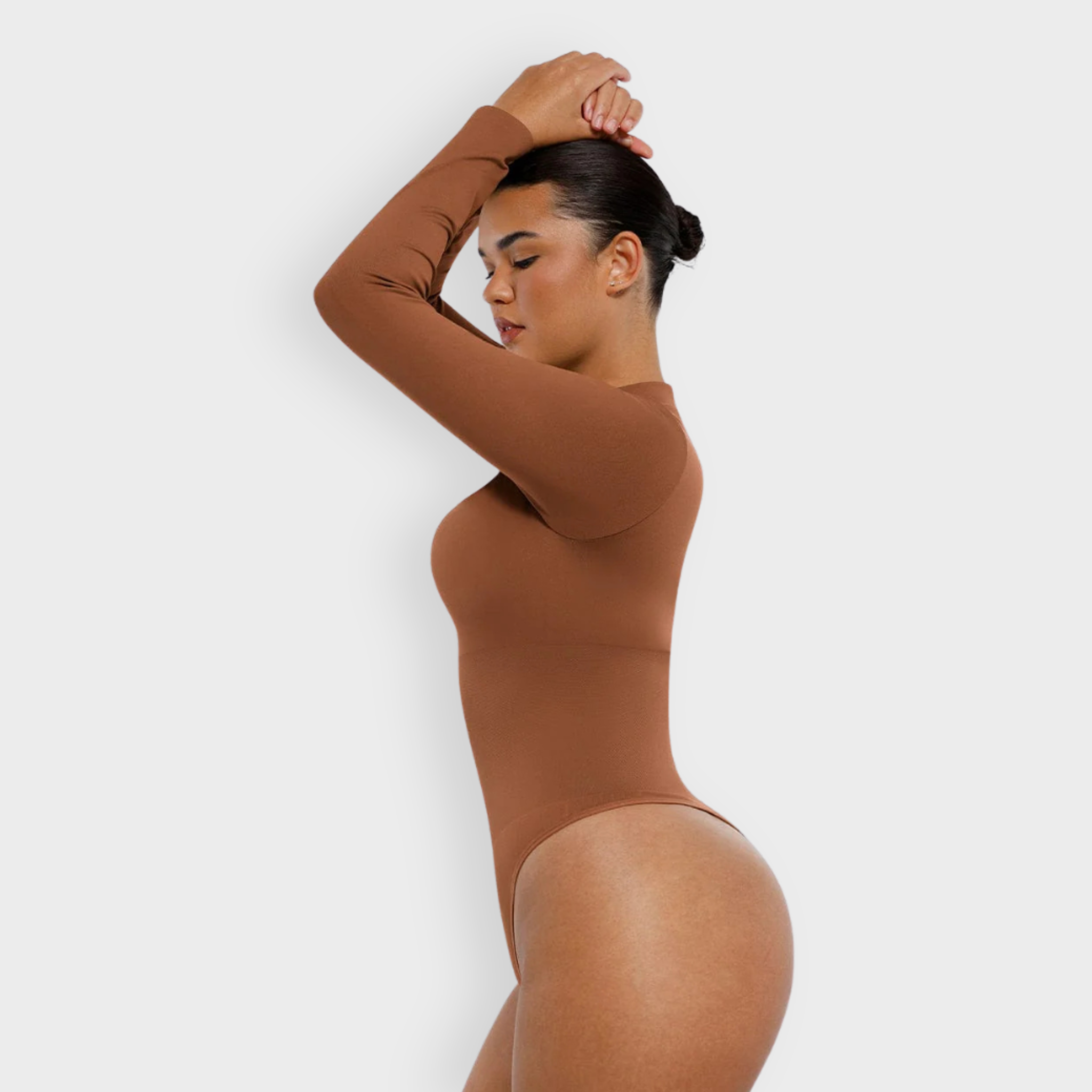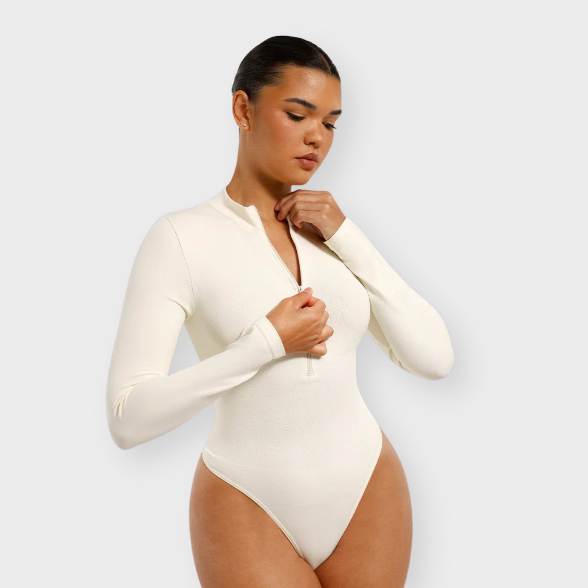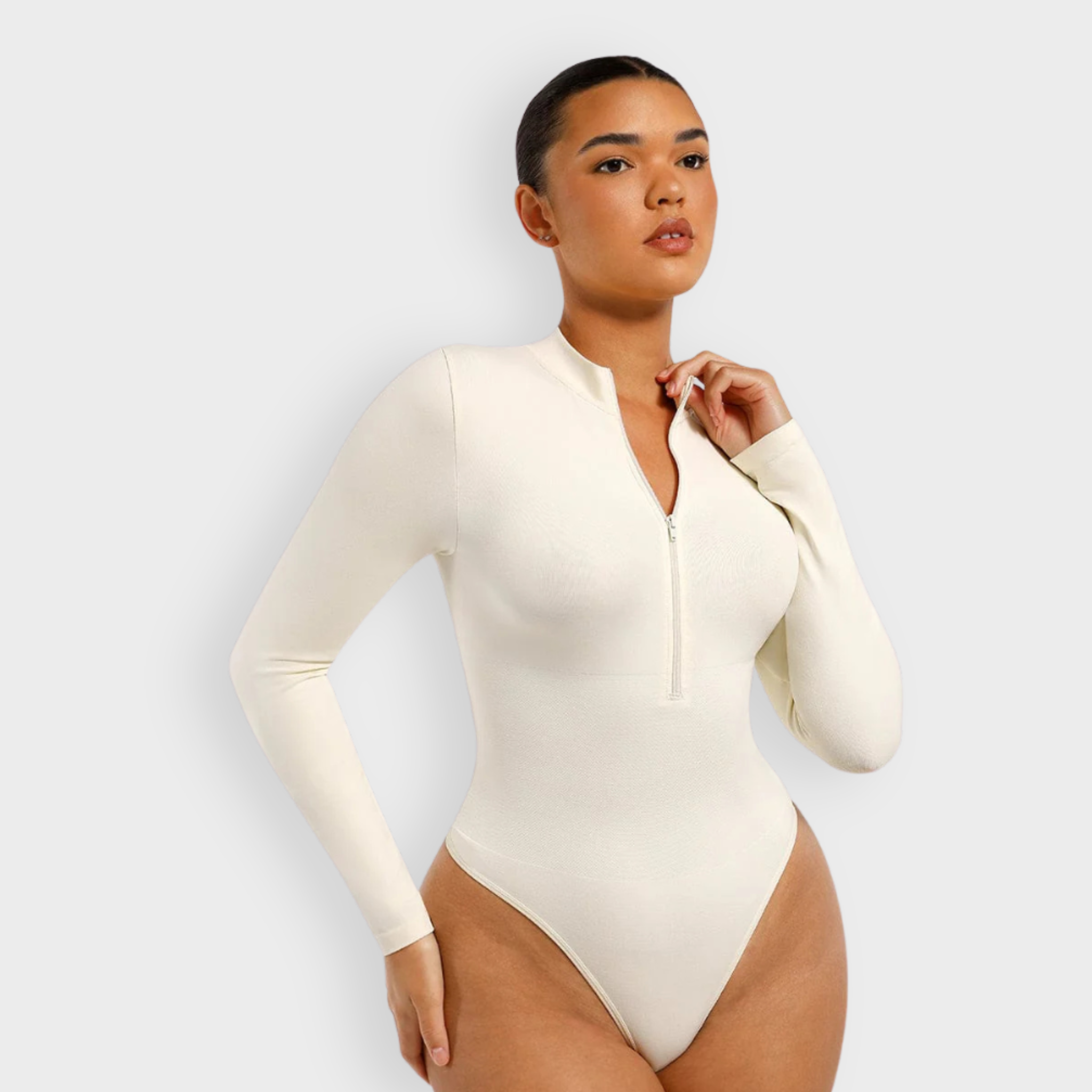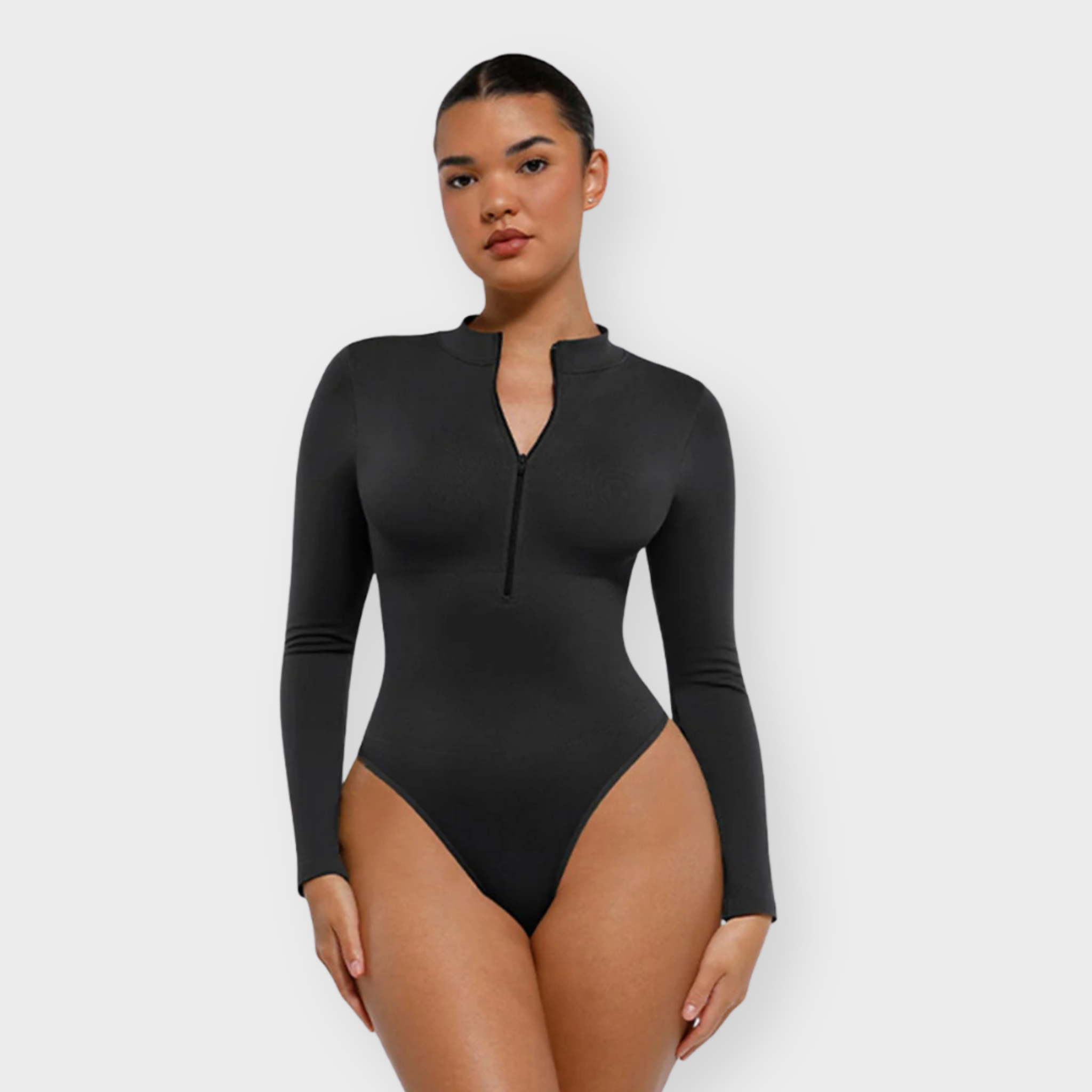 This long sleeve thong bodysuit delivers light shaping and bold versatility. Crafted from ultra-soft, high-stretch seamless knit, it contours the waist and abdomen while allowing total freedom of movement. The stand-up collar and front zipper give you two neckline options—zipped up for clean lines or open for a sultry V-neck. A snap closure crotch adds effortless functionality, and the thong cut ensures a no-lines finish under any outfit. Pair it with jeans, trousers, or skirts for a modern, pulled-together silhouette.