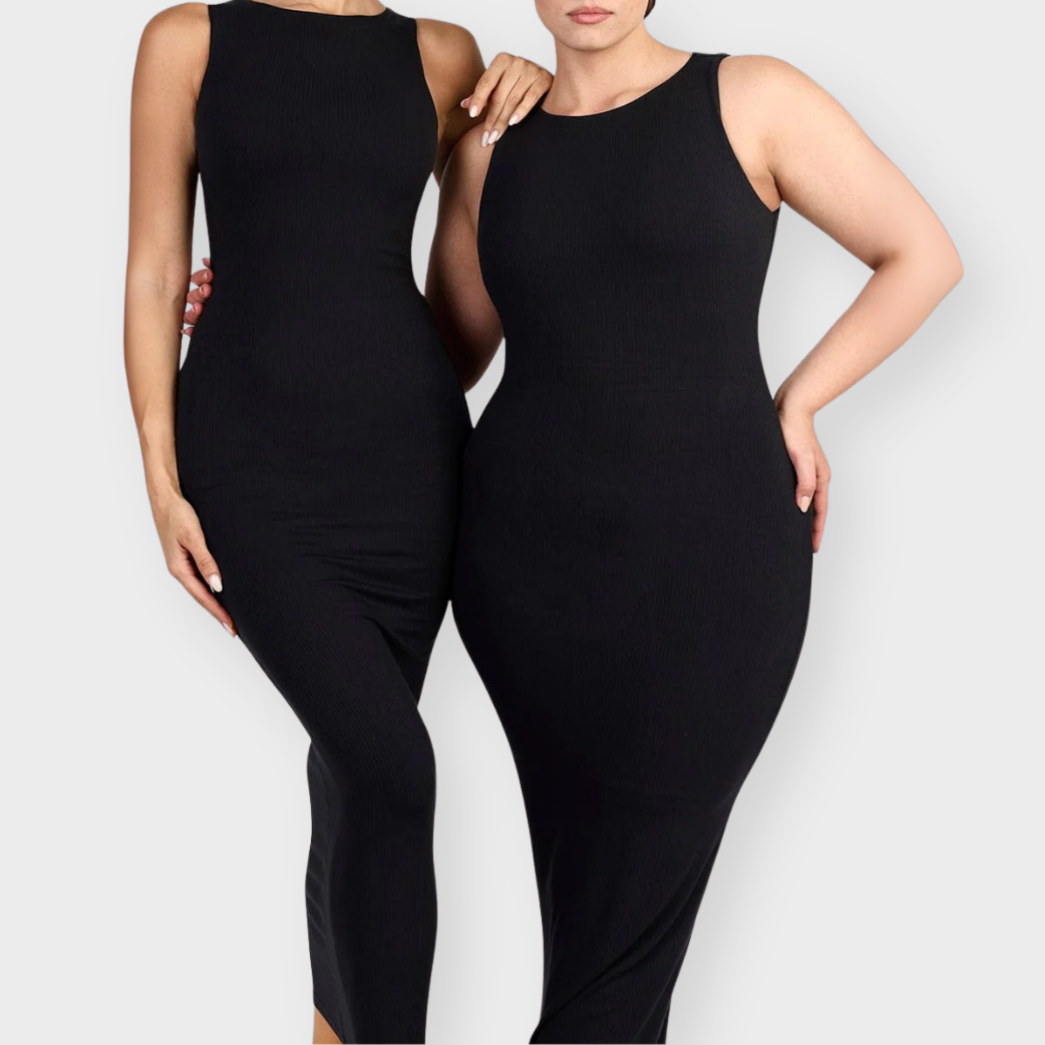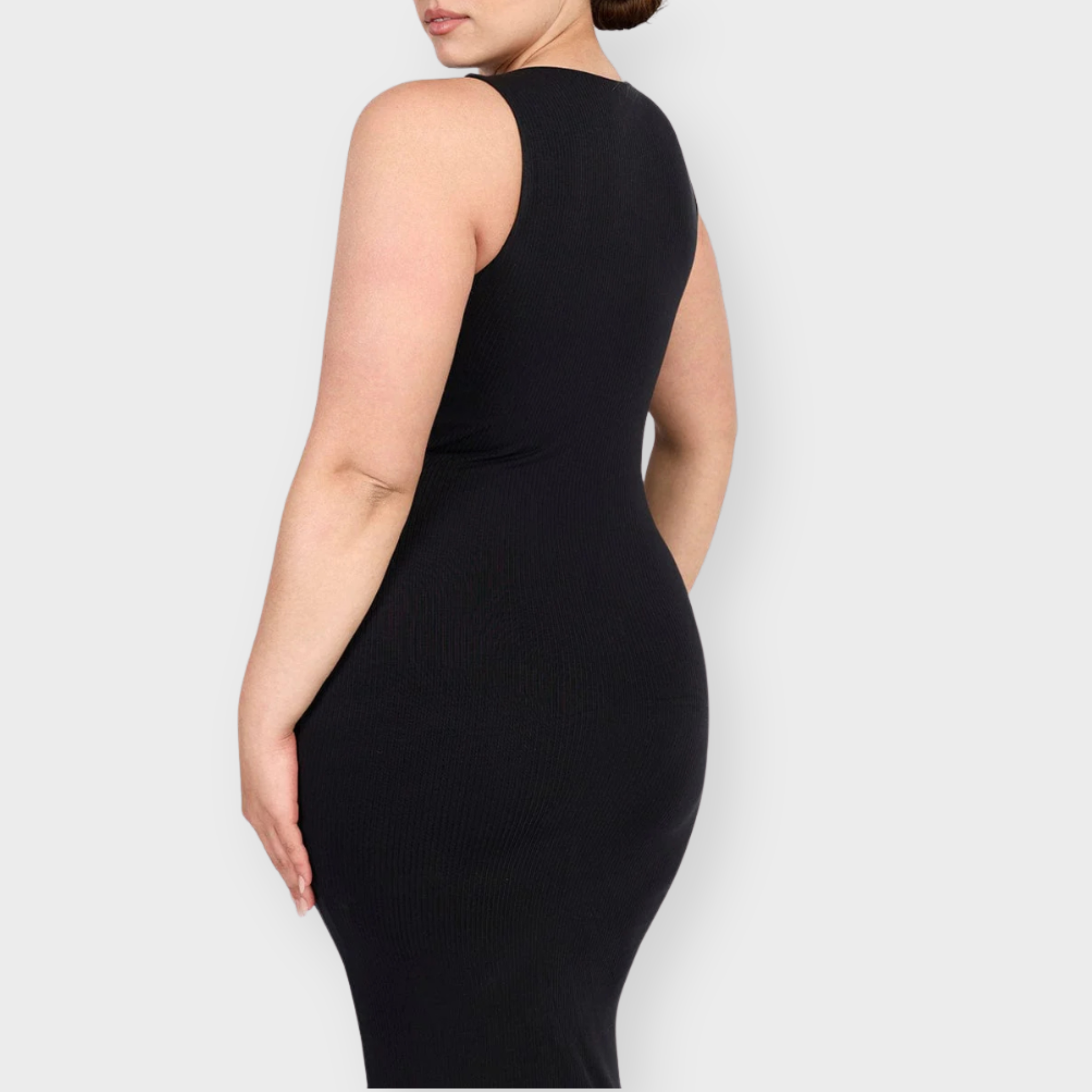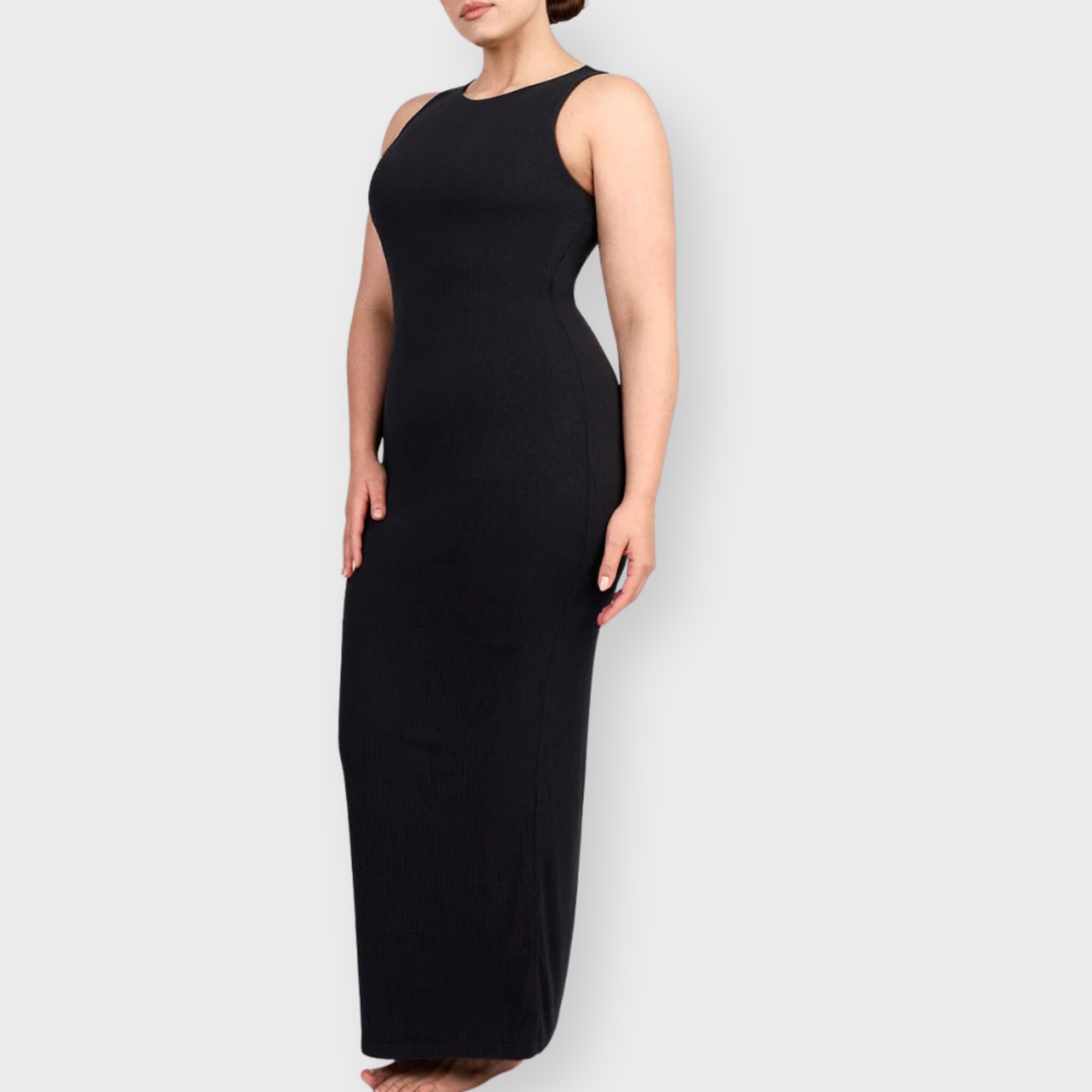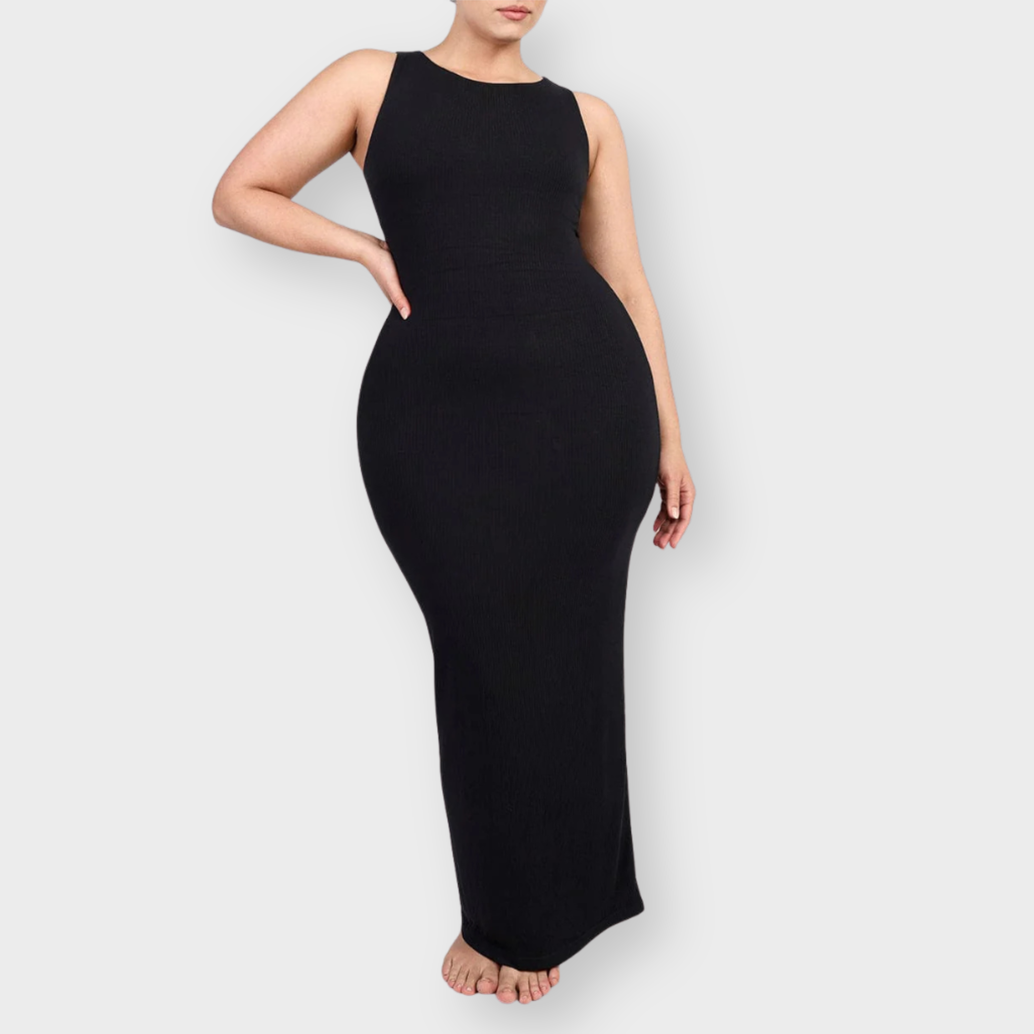 Soft meets sculpted in this sleek maxi shapewear dress with built-in support. Featuring a classic crew neckline and a flattering close-to-body fit, this wardrobe essential is double-lined with shaping mesh that enhances your natural curves. The inner waist and abdomen panels offer gentle compression, while a side-drawn mesh at the bust softly contours your silhouette. With a supportive underbust design and removable cup insert slots, you can wear it your way—bra-free, confident, and effortlessly put together.