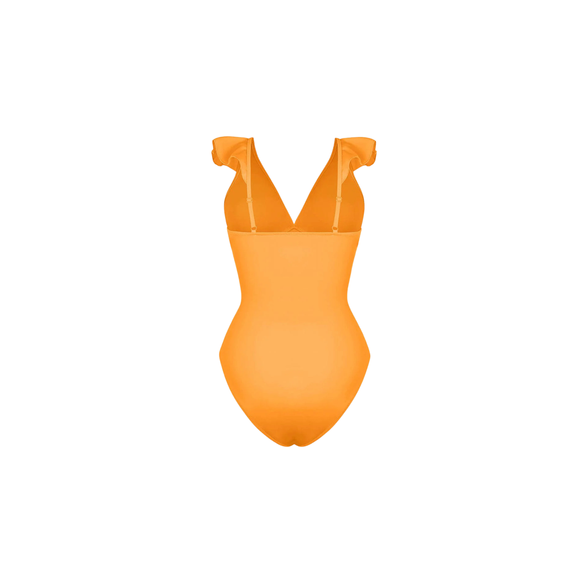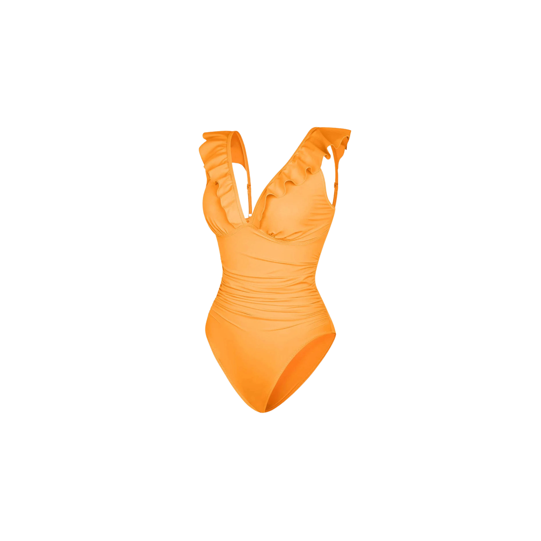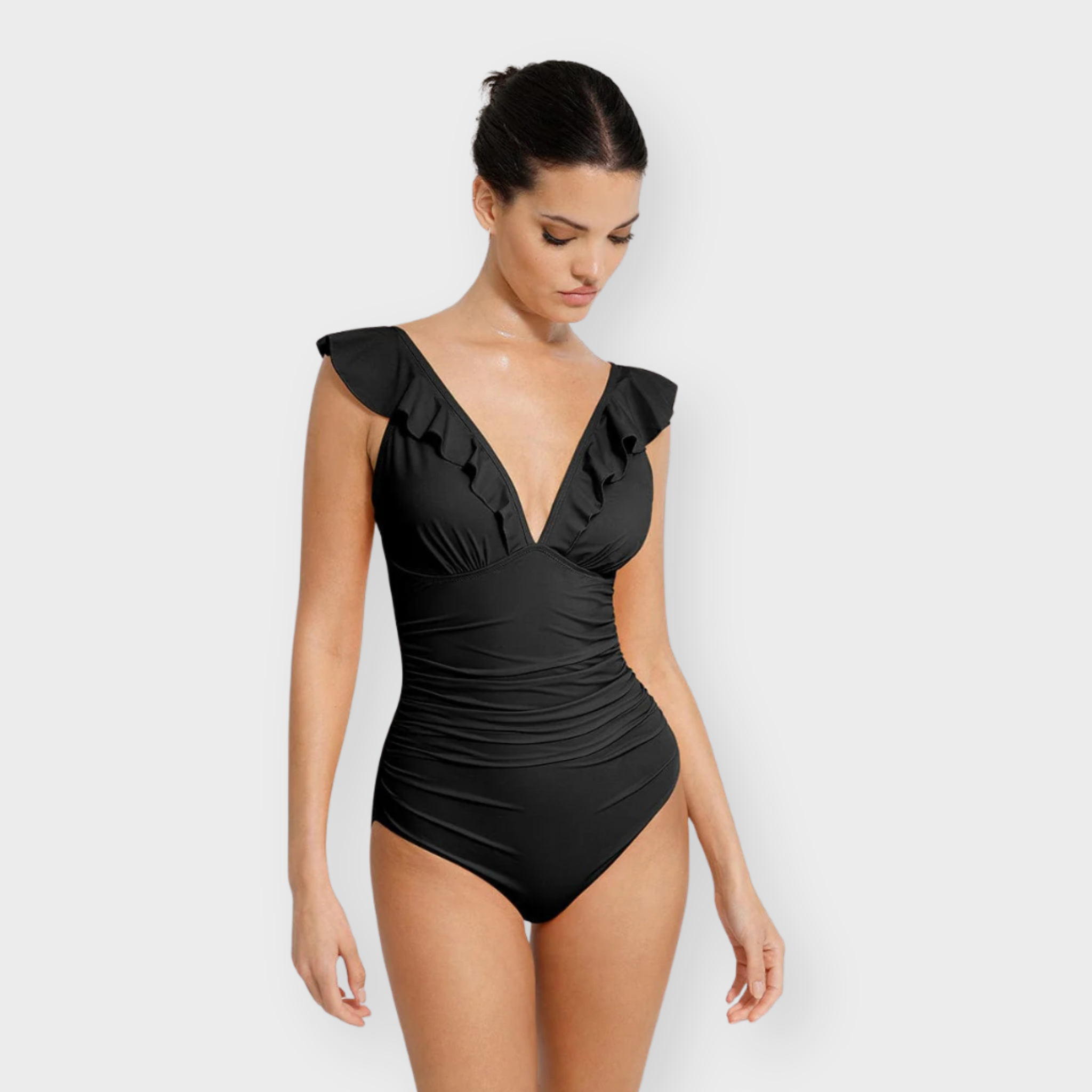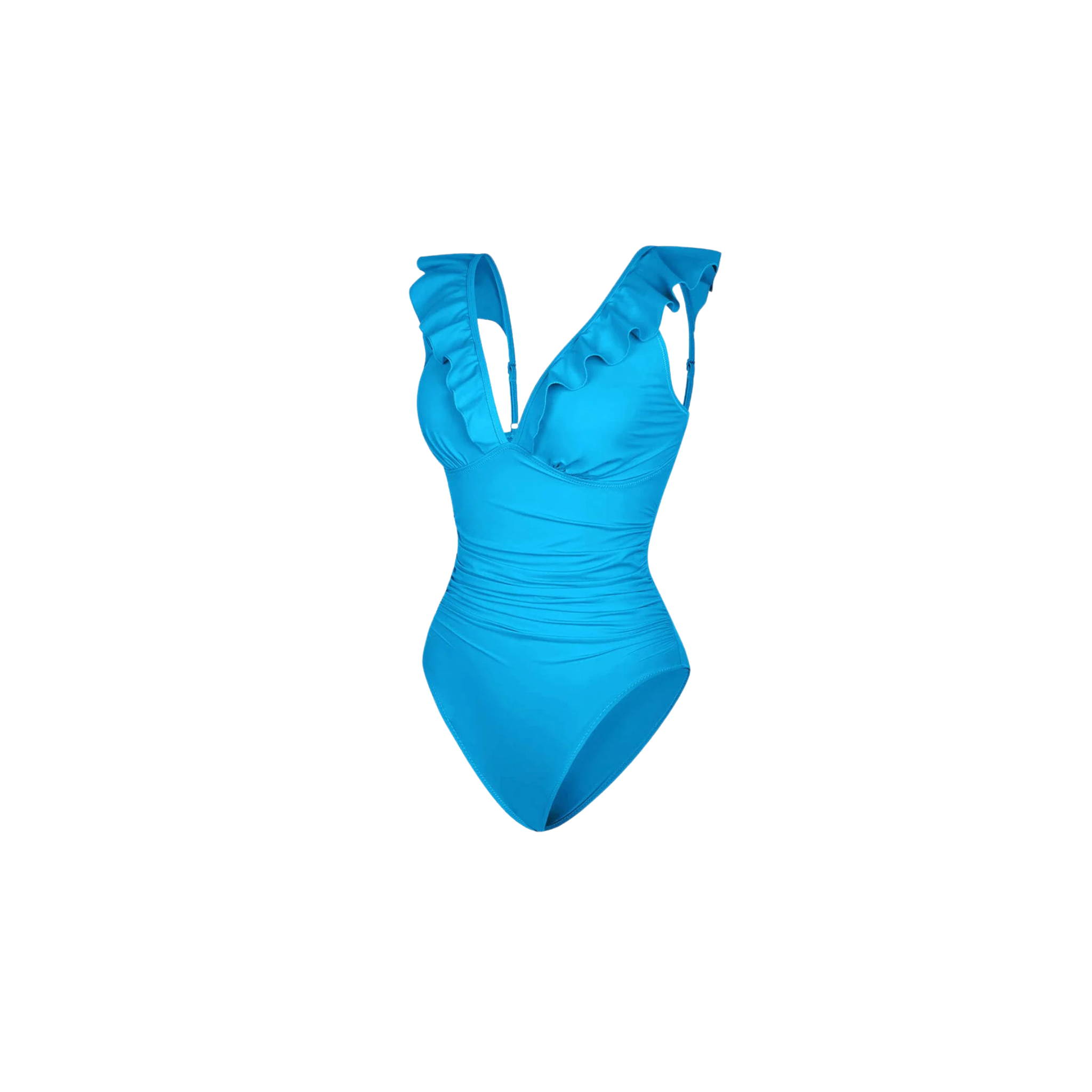 Flattering meets feminine in this sculpting one-piece with playful ruffle detailing. Designed to smooth and shape, the double-layer construction features a high-stretch outer layer and built-in compression mesh that contours the waist, tummy, and back. A deep V-neckline with ruffle trim adds charm while subtly enhancing and supporting your shape—with no wires, just comfort. Adjustable straps and a ruched waist complete the look for a confident fit you’ll love to live in.