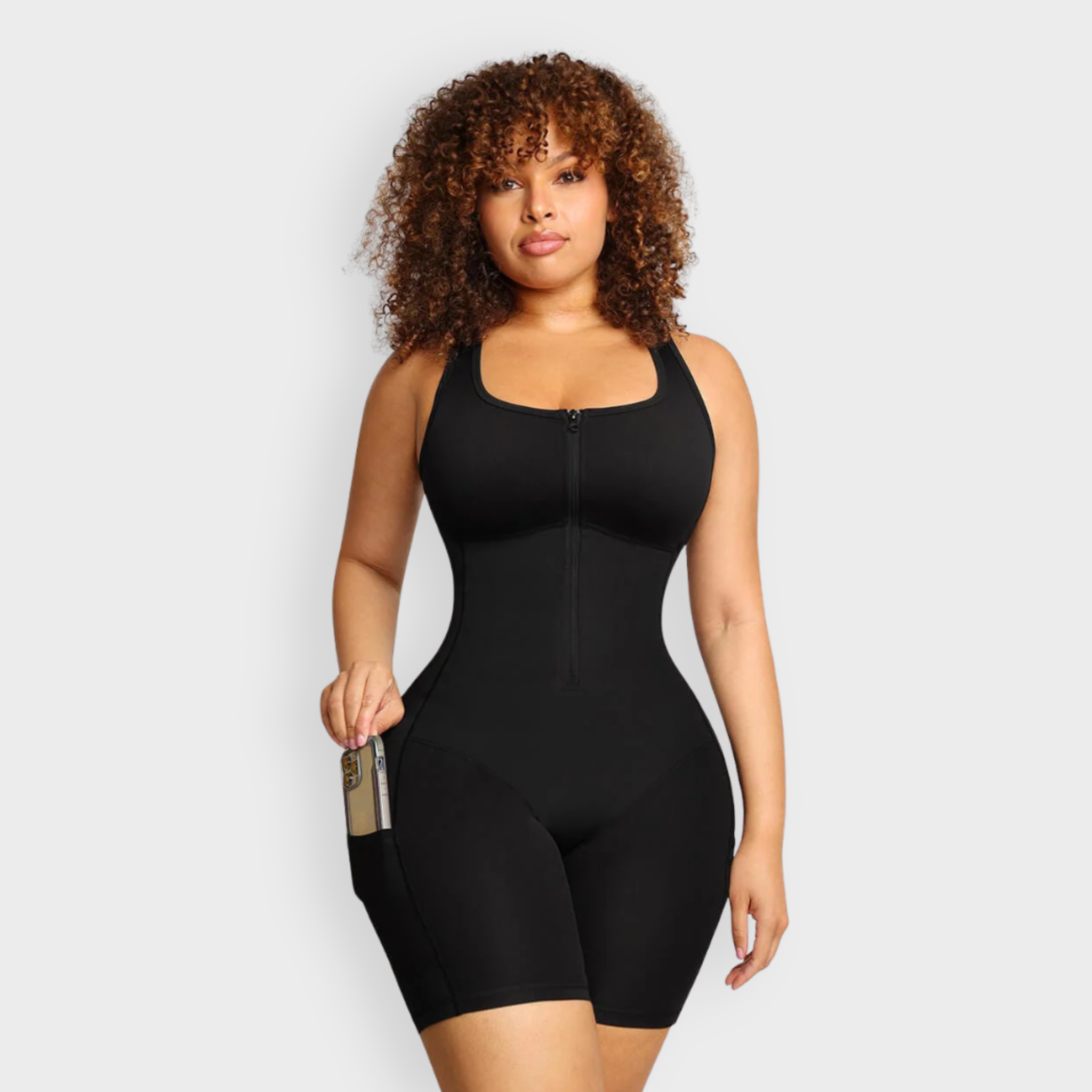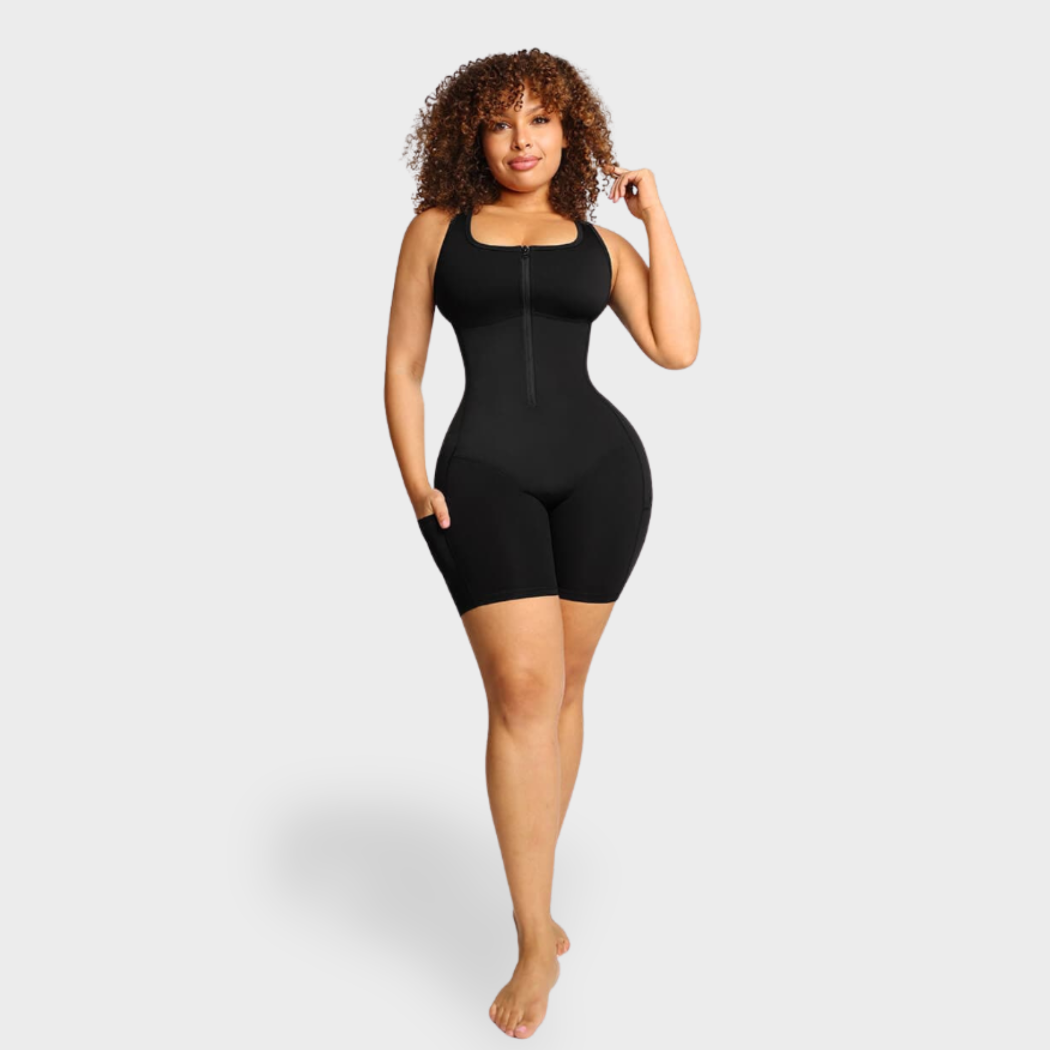 this sauna-style active bodysuit targets your waist, back, and core with triple-layer thermal compression for maximum shaping and heat retention. Designed for dynamic movement, the I-zone features breathable stretch fabric that supports every lunge, sprint, and stretch without restriction. A unique hidden thermal coating boosts circulation without clinging to your skin, keeping you dry and comfortable. With a wireless, shockproof built-in bra and sculpted leg fit, this piece elevates your workouts—and your shape. Side pockets keep essentials close so nothing slows you down.