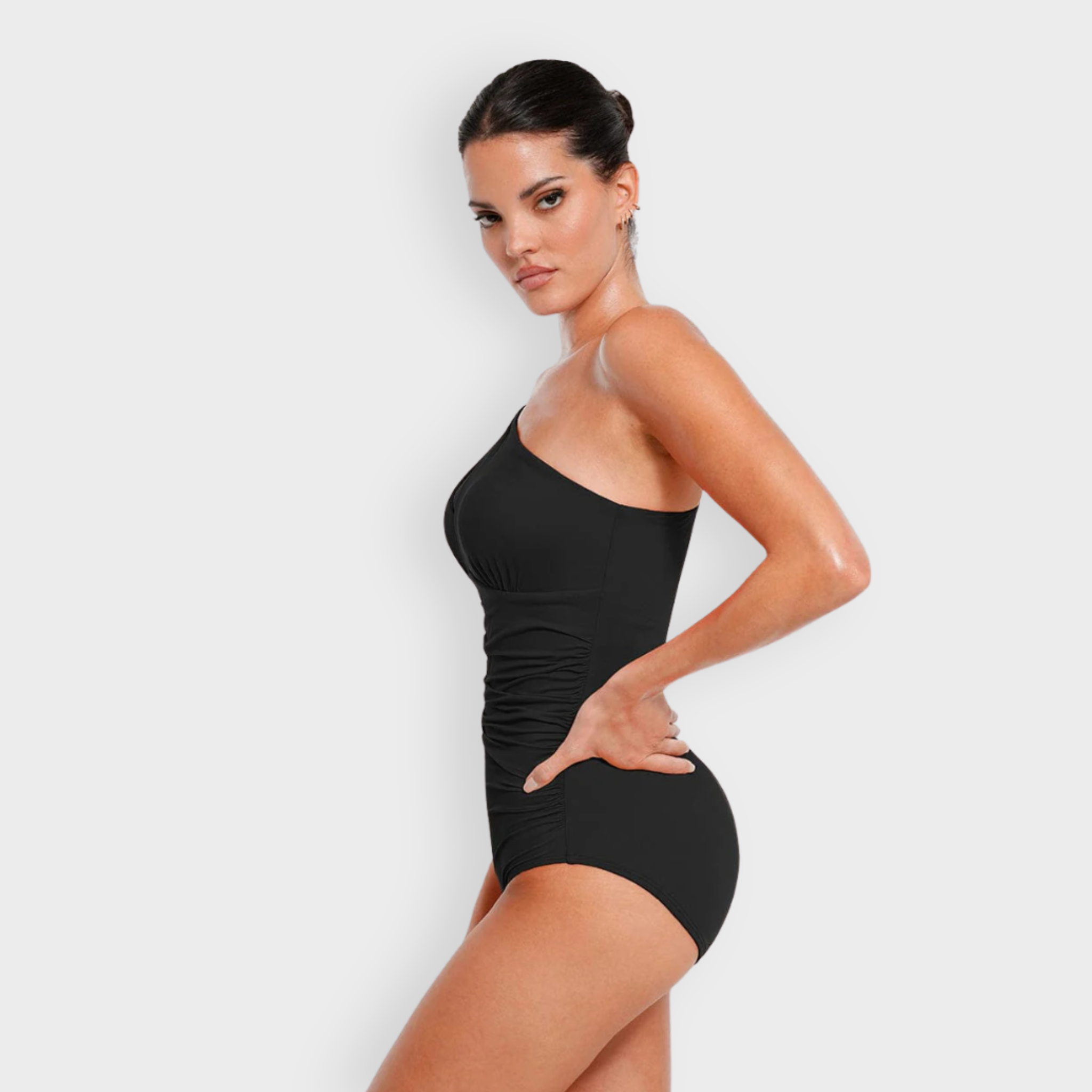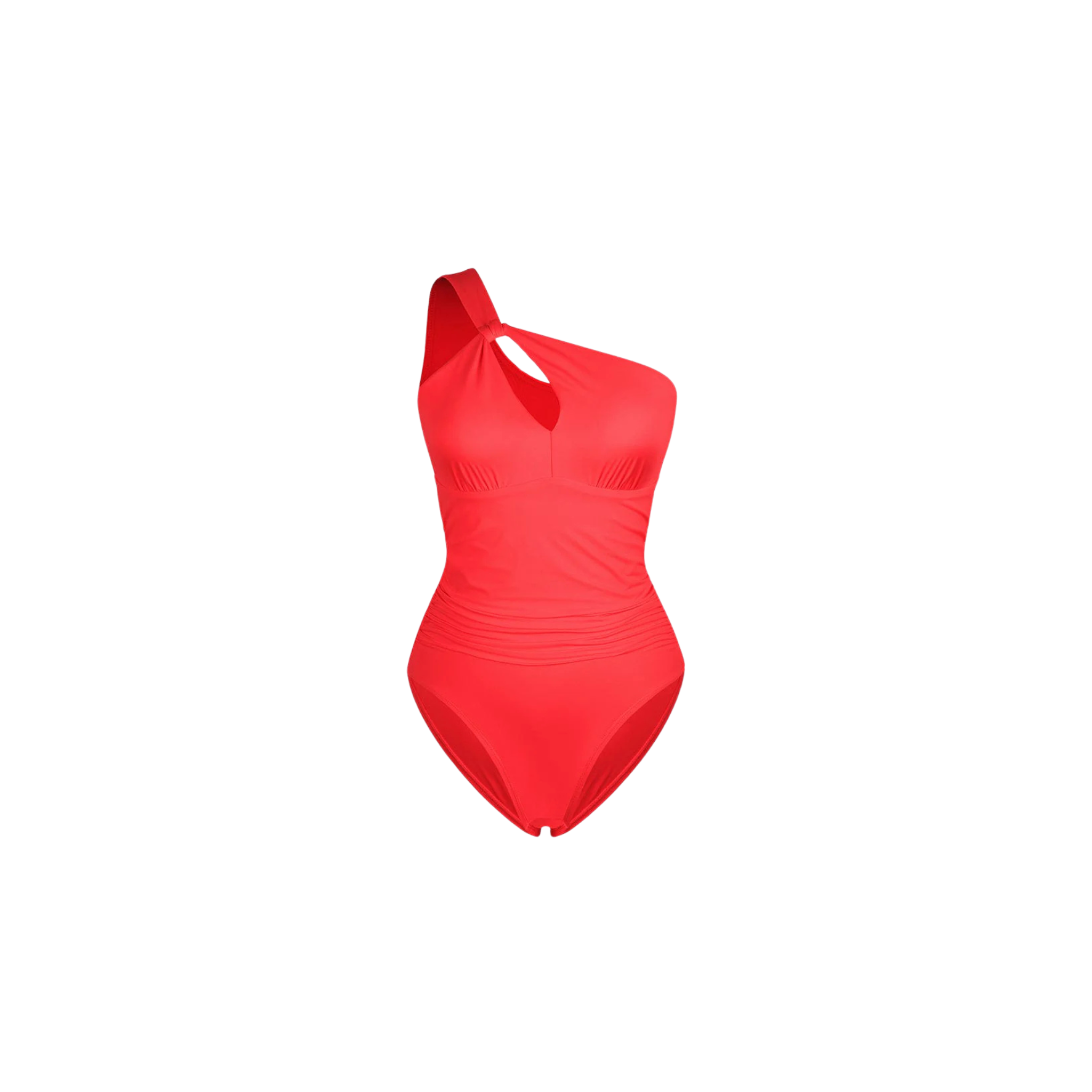 Sculpting support meets standout style. This contouring one-piece is crafted with high-stretch swim fabric and an inner shaping mesh that smooths and defines. The asymmetrical one-shoulder design and cut-out detail elevate the look, while strategic compression sculpts your waist and supports your bust—all without wires. From high-back coverage to a pleated waistline, every detail is designed to flatter, lift, and turn heads.