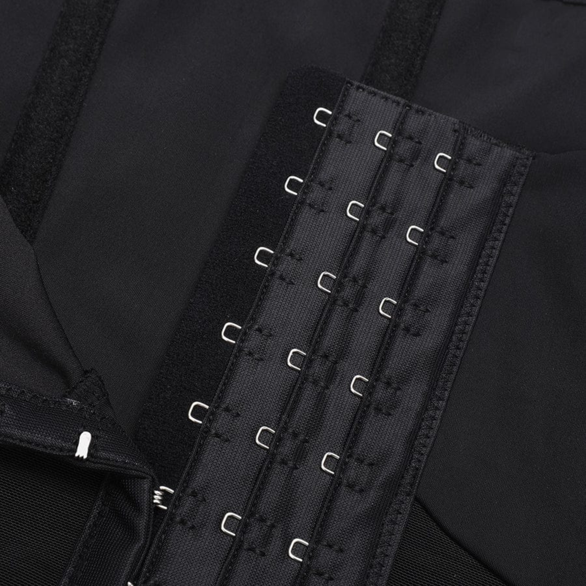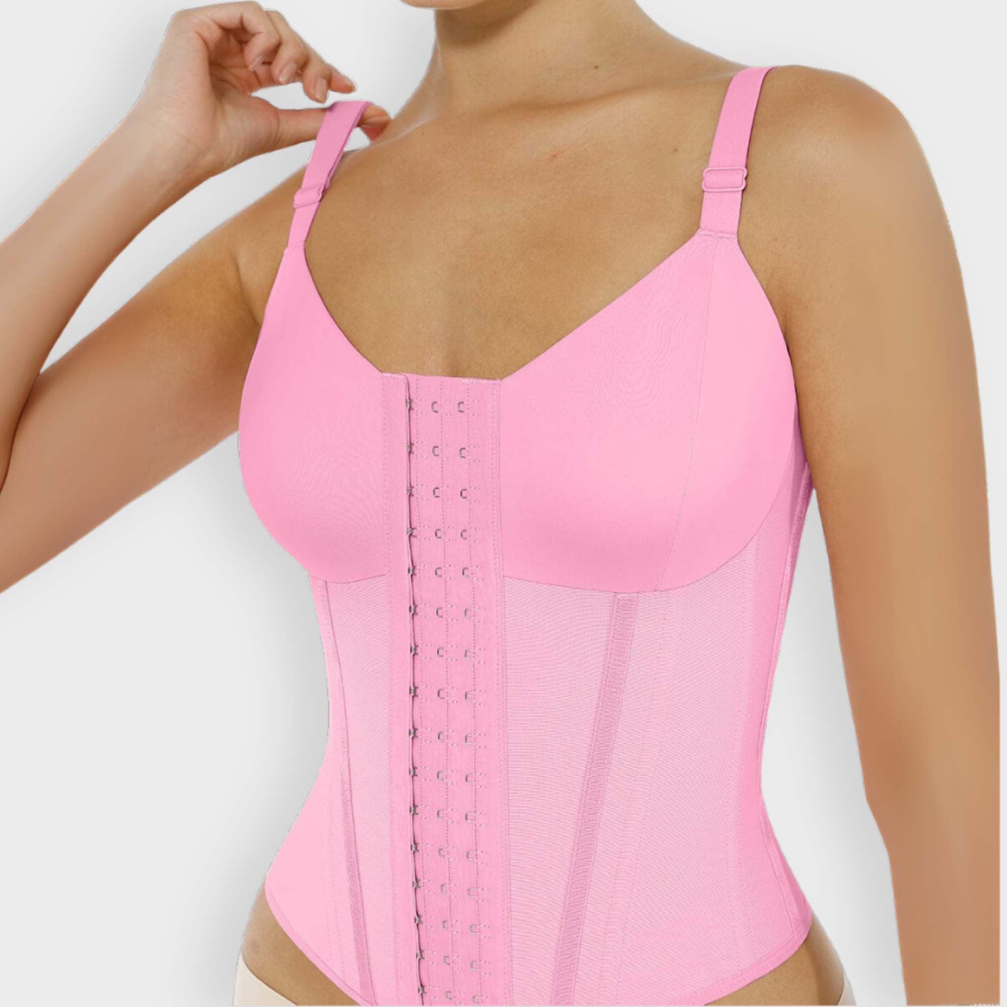 Three rows of adjustable front closures allow custom fit for various body types