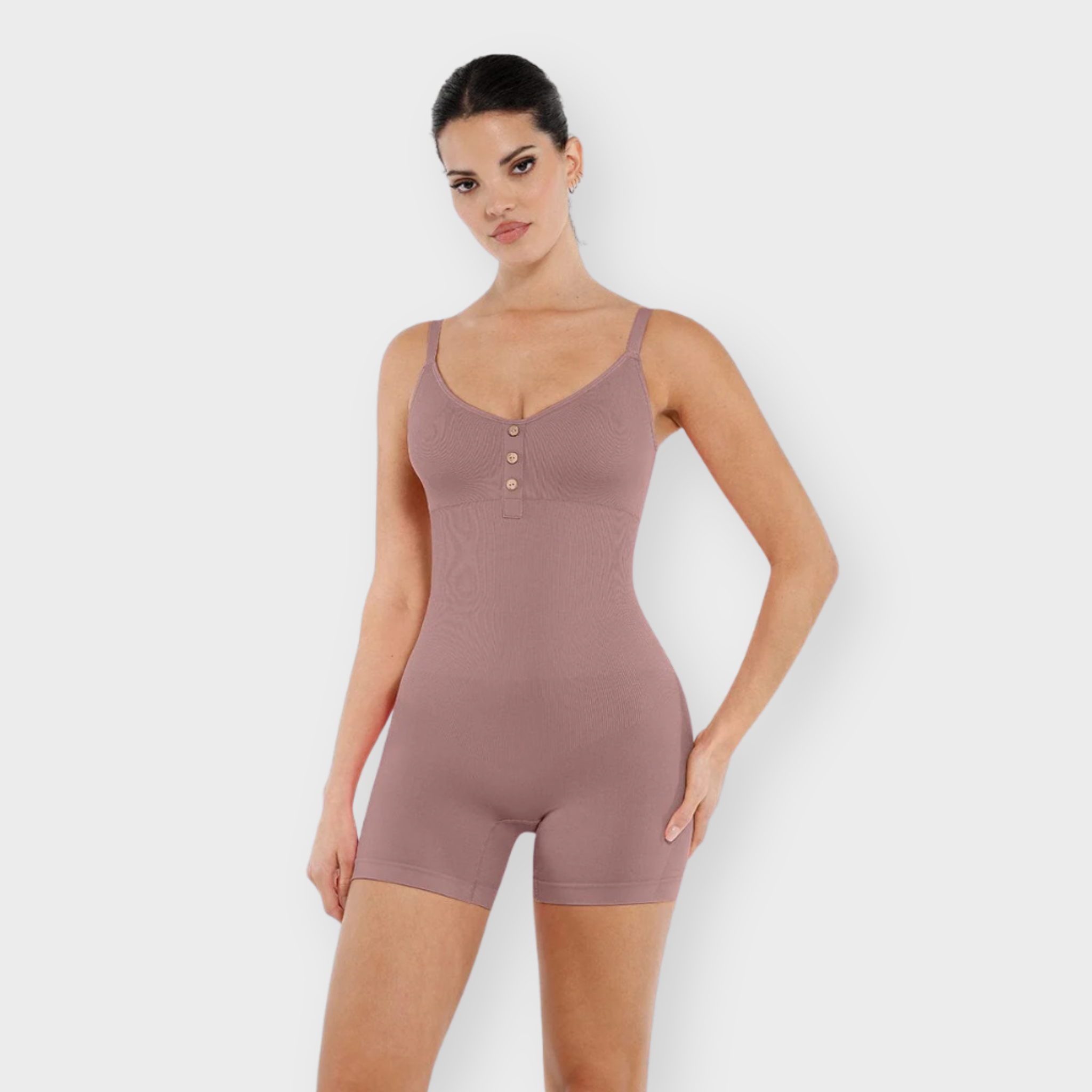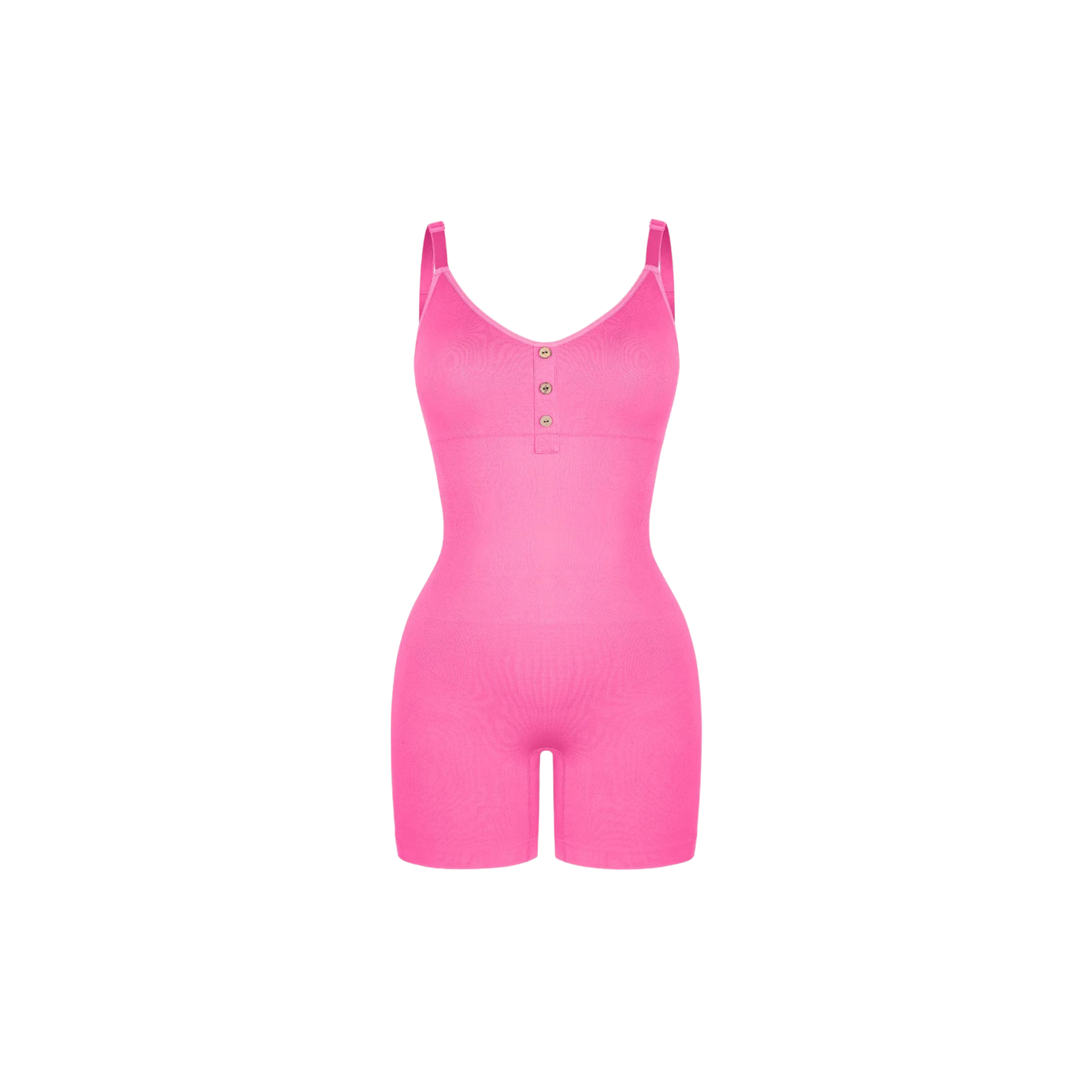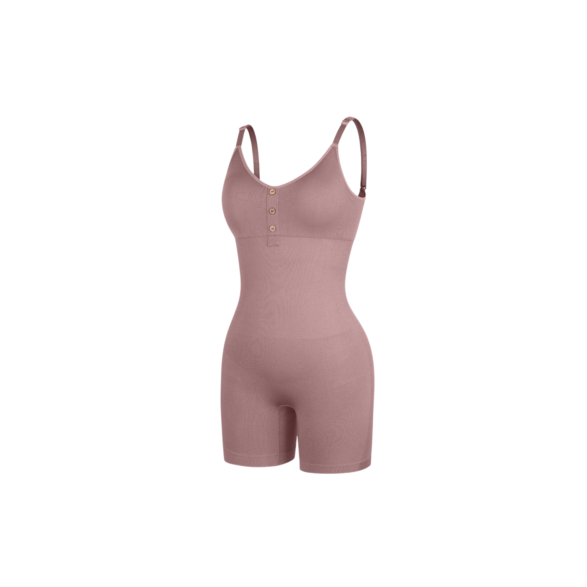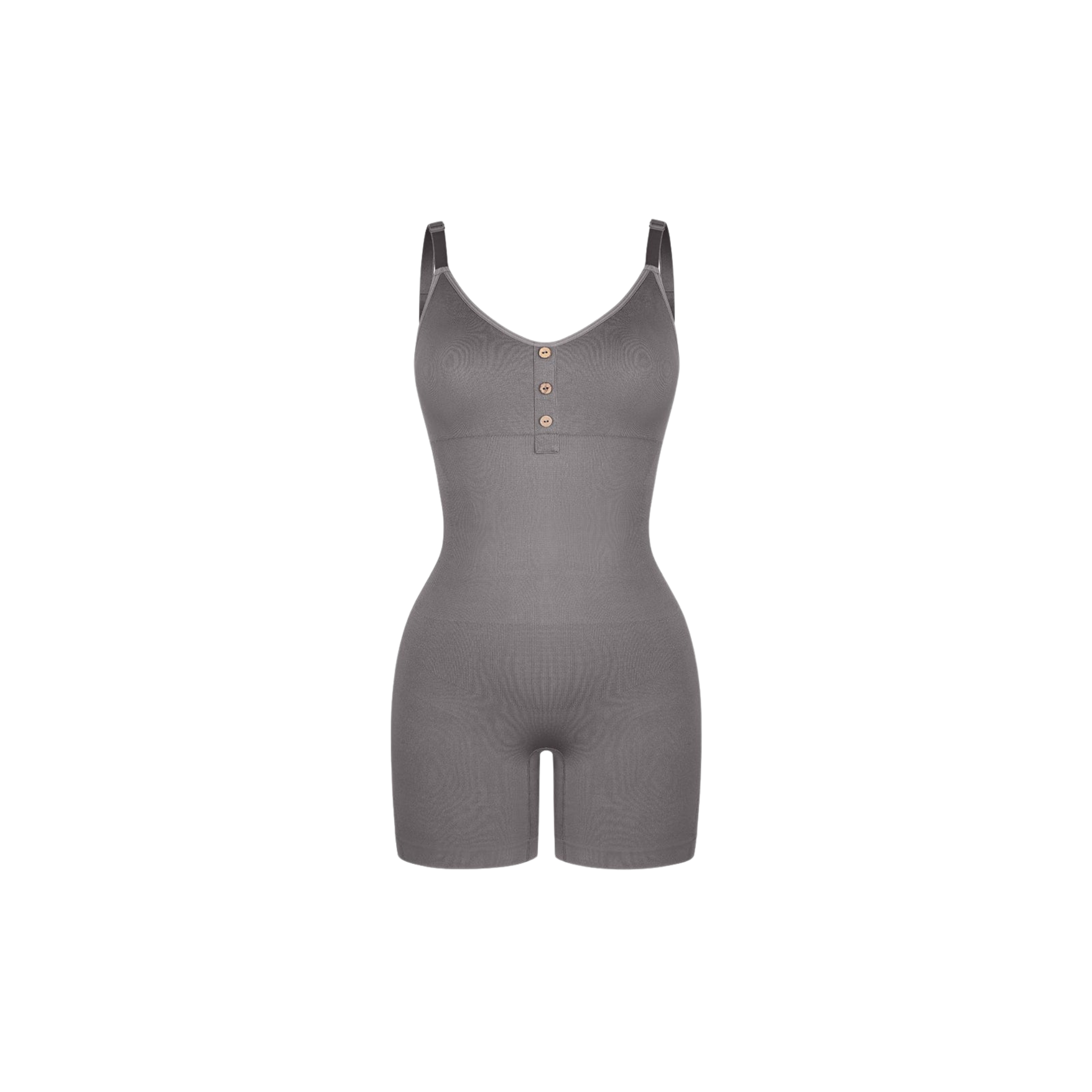This Ribbed Jumpsuit delivers seamless support with fashion-forward flair. Its heart-shaped neckline flatters the bust, while the faux Henley collar and coconut shell button detail add a laid-back, styled-up finish. Ribbed, double-knit fabric contours the waist and hips with subtle compression, sculpting your figure while remaining breathable and comfortable. With built-in bust support and removable padding, it eliminates the need for a bra. From lounging to layering, this jumpsuit is your all-day sculpting essential.