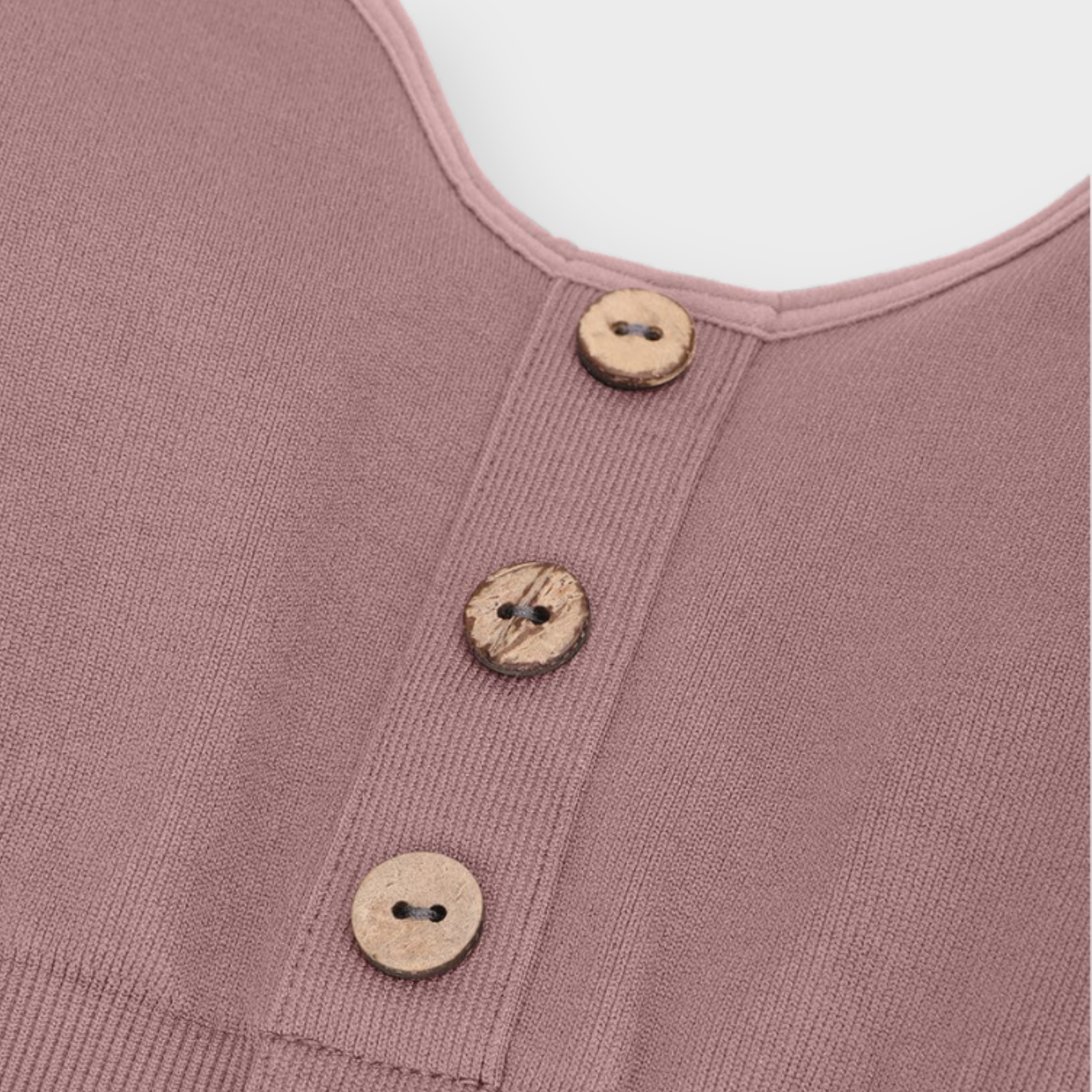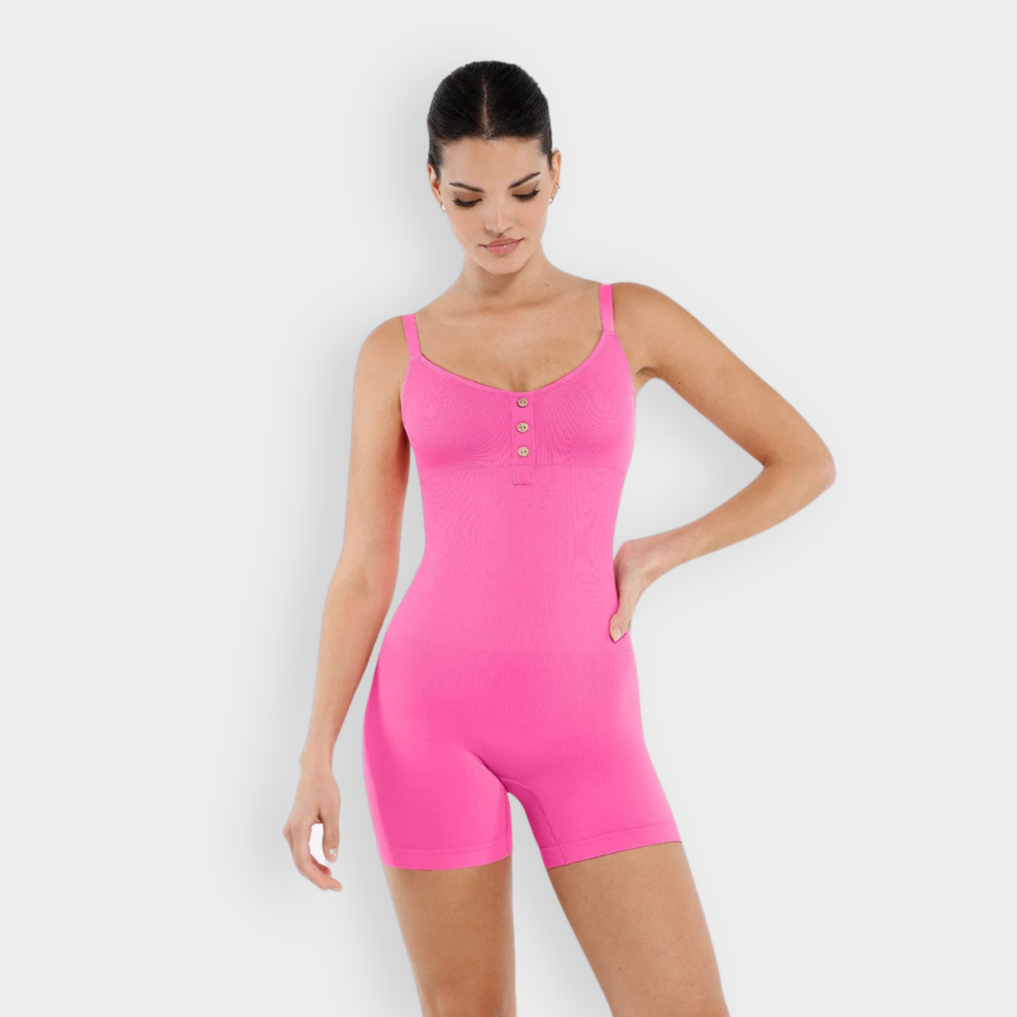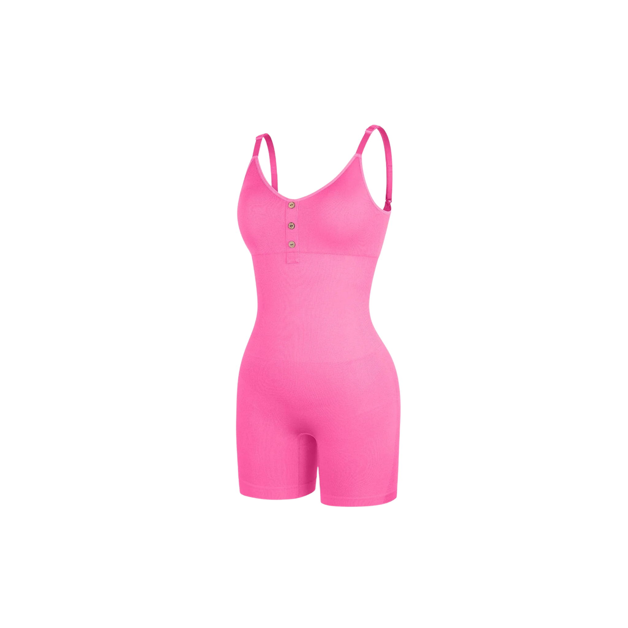 This Ribbed Jumpsuit delivers seamless support with fashion-forward flair. Its heart-shaped neckline flatters the bust, while the faux Henley collar and coconut shell button detail add a laid-back, styled-up finish. Ribbed, double-knit fabric contours the waist and hips with subtle compression, sculpting your figure while remaining breathable and comfortable. With built-in bust support and removable padding, it eliminates the need for a bra. From lounging to layering, this jumpsuit is your all-day sculpting essential.