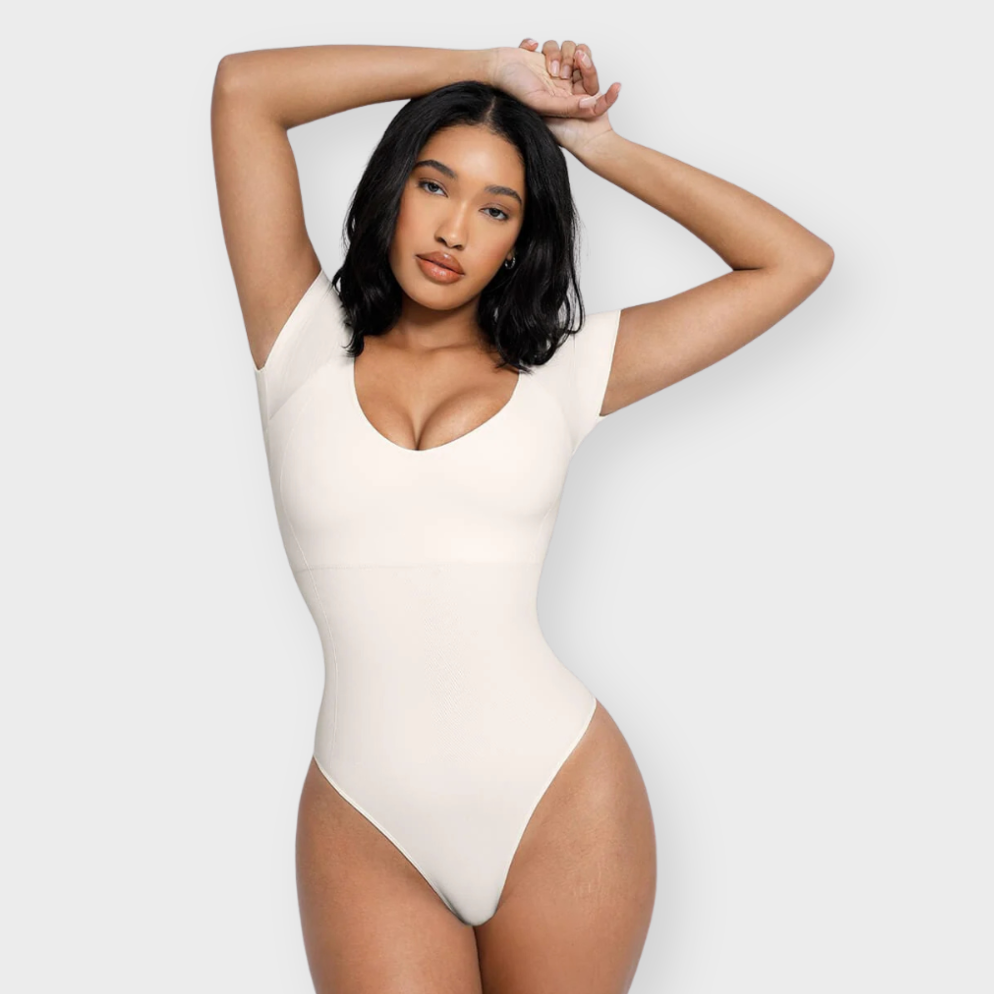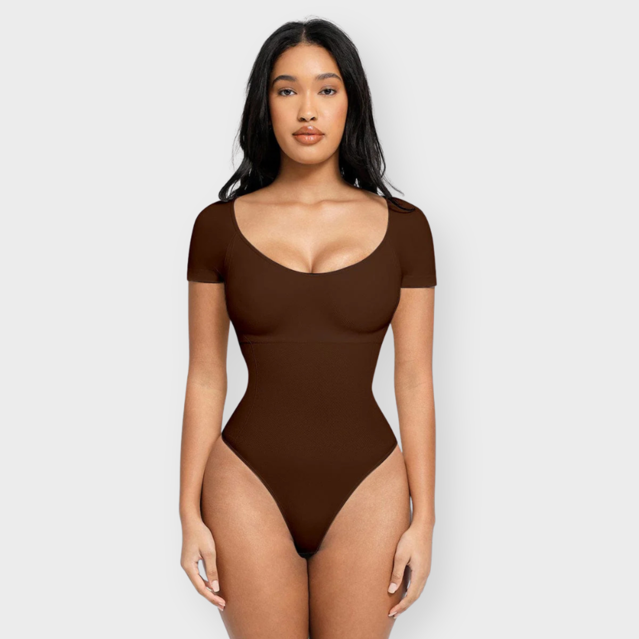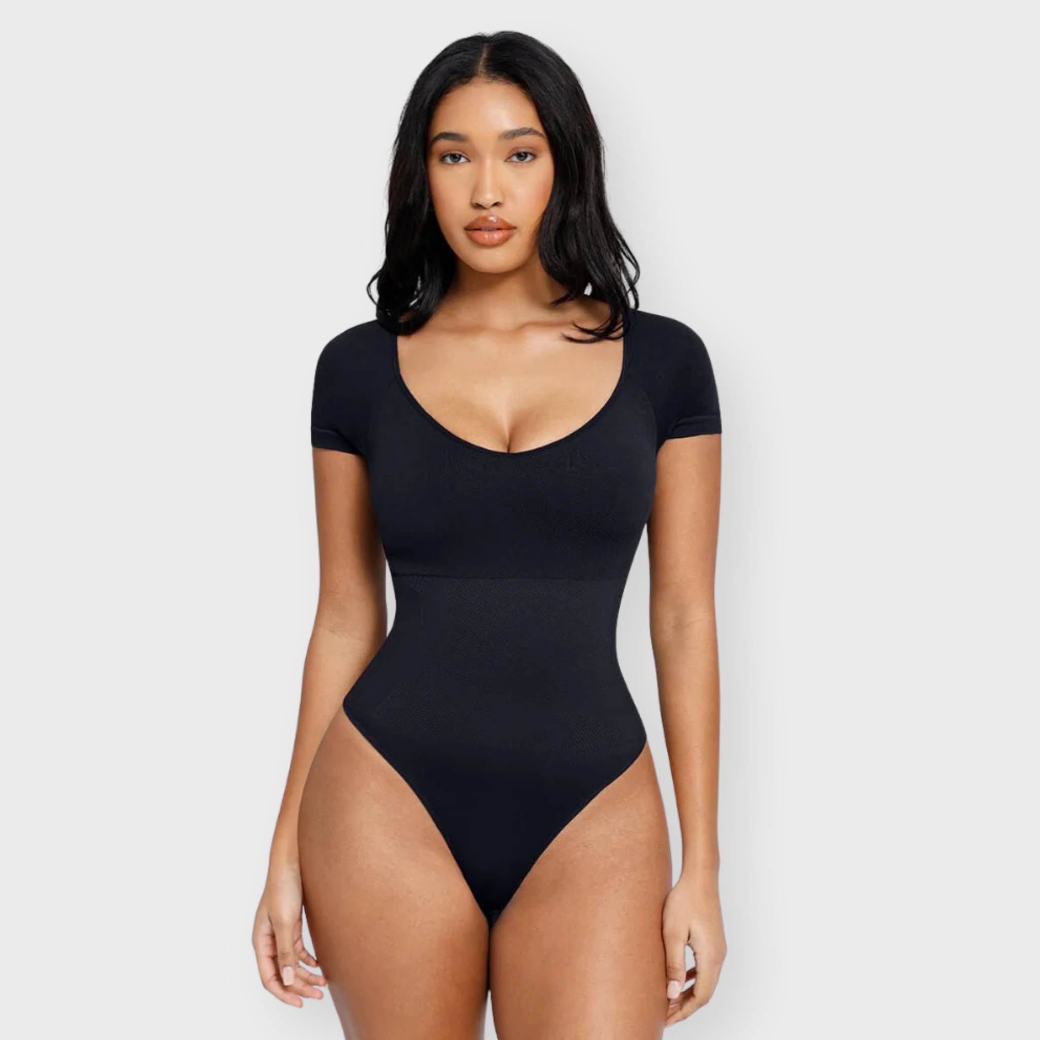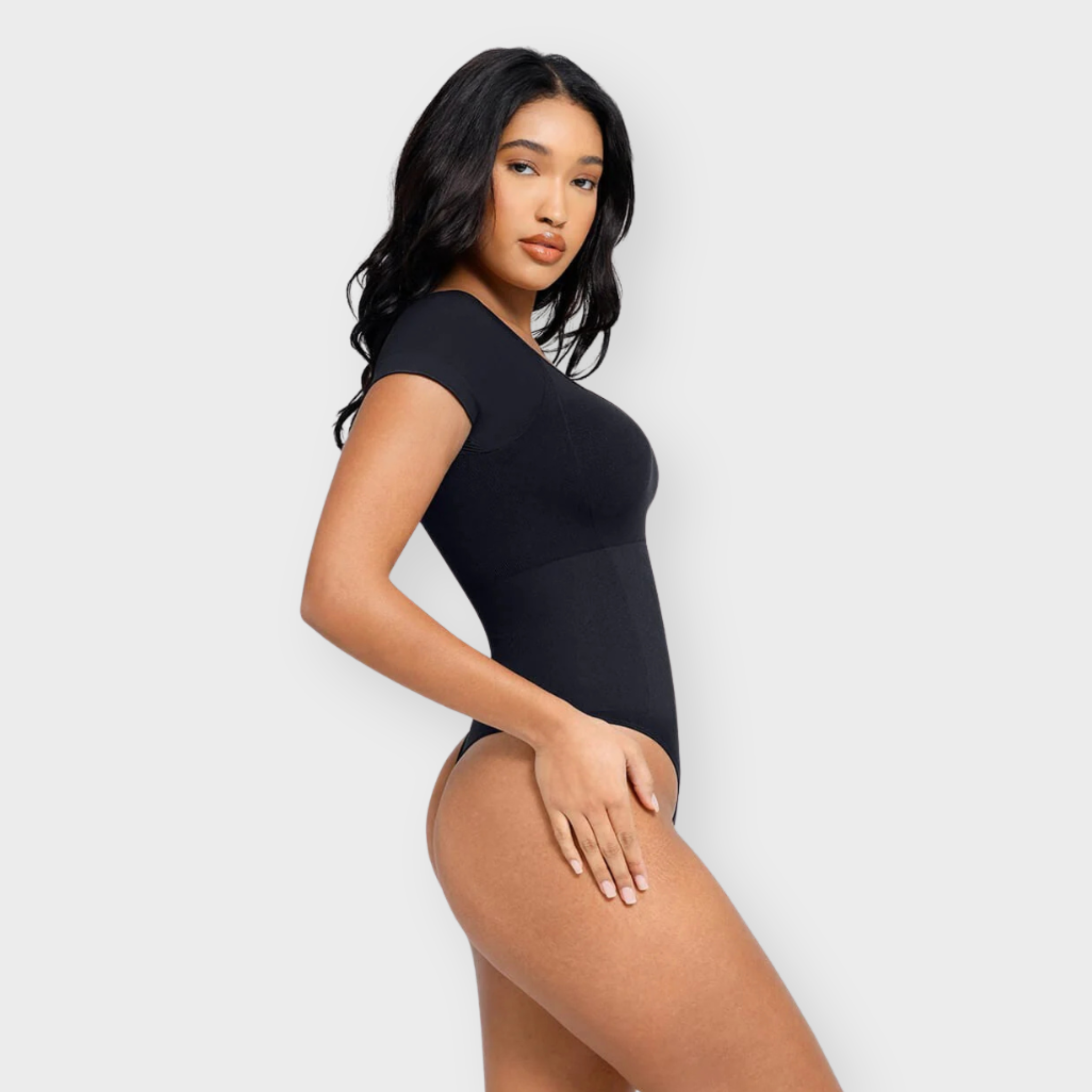 A power piece that delivers everyday sculpting with serious support. This eco-conscious thong bodysuit features a structured square neckline and curved shoulder cut that flatters your chest and collarbone, while the reinforced lower abdomen panel smooths and tightens with every wear. Designed for daily layering or solo styling—this one does it all.