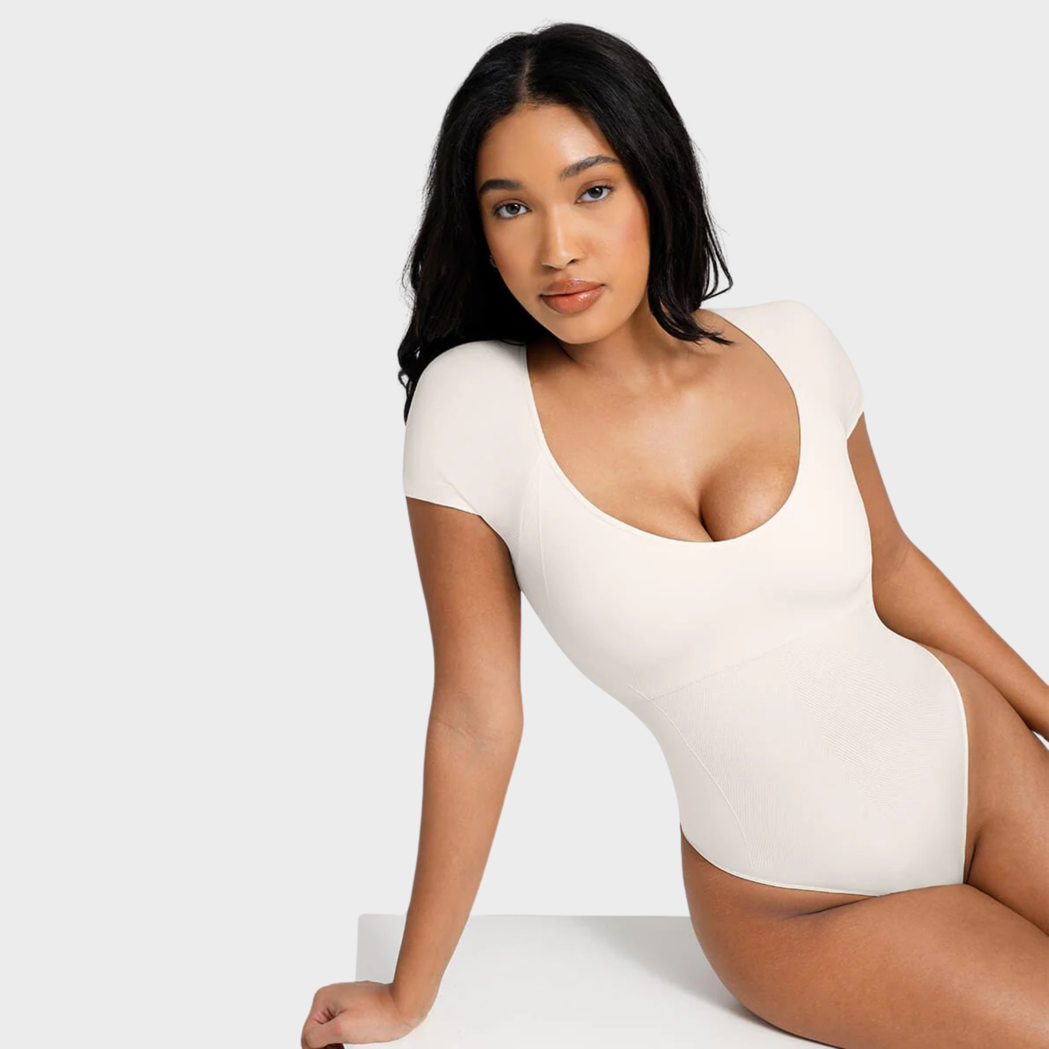 Structured square neckline with curved shoulders for a chest-enhancing effect