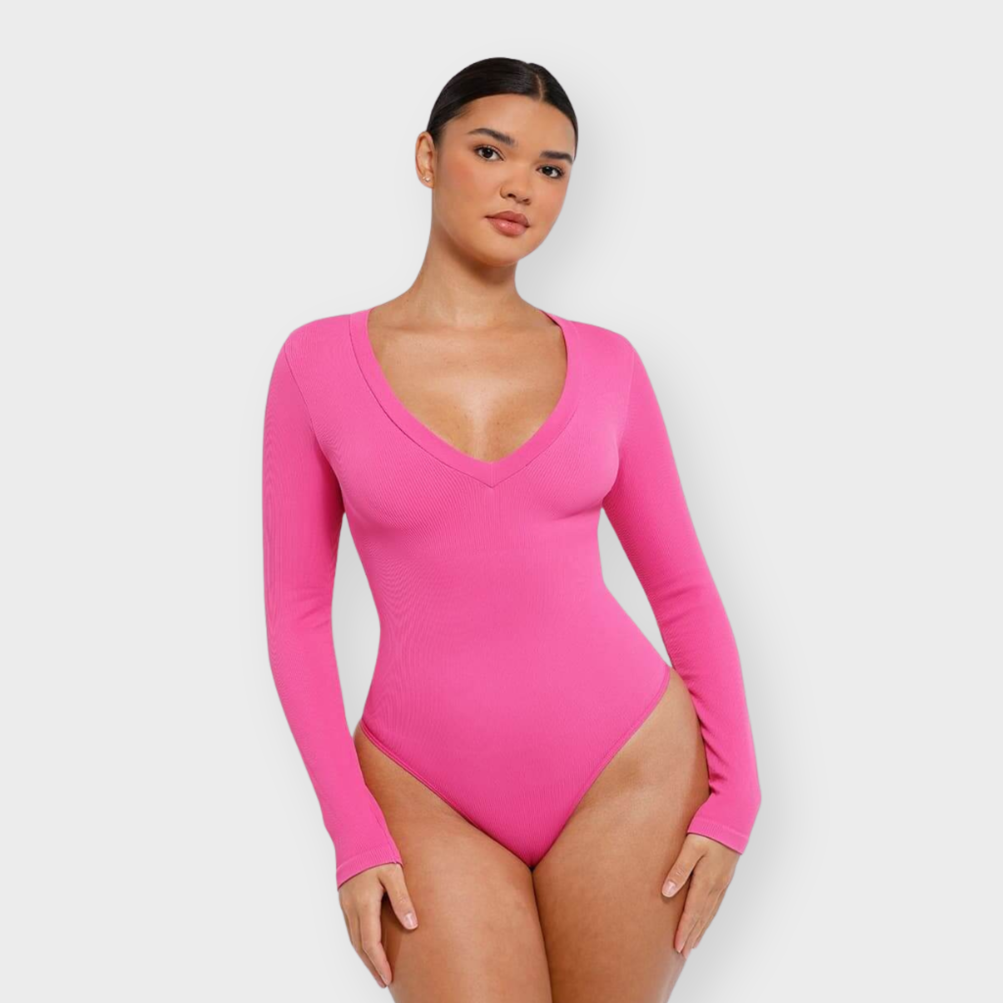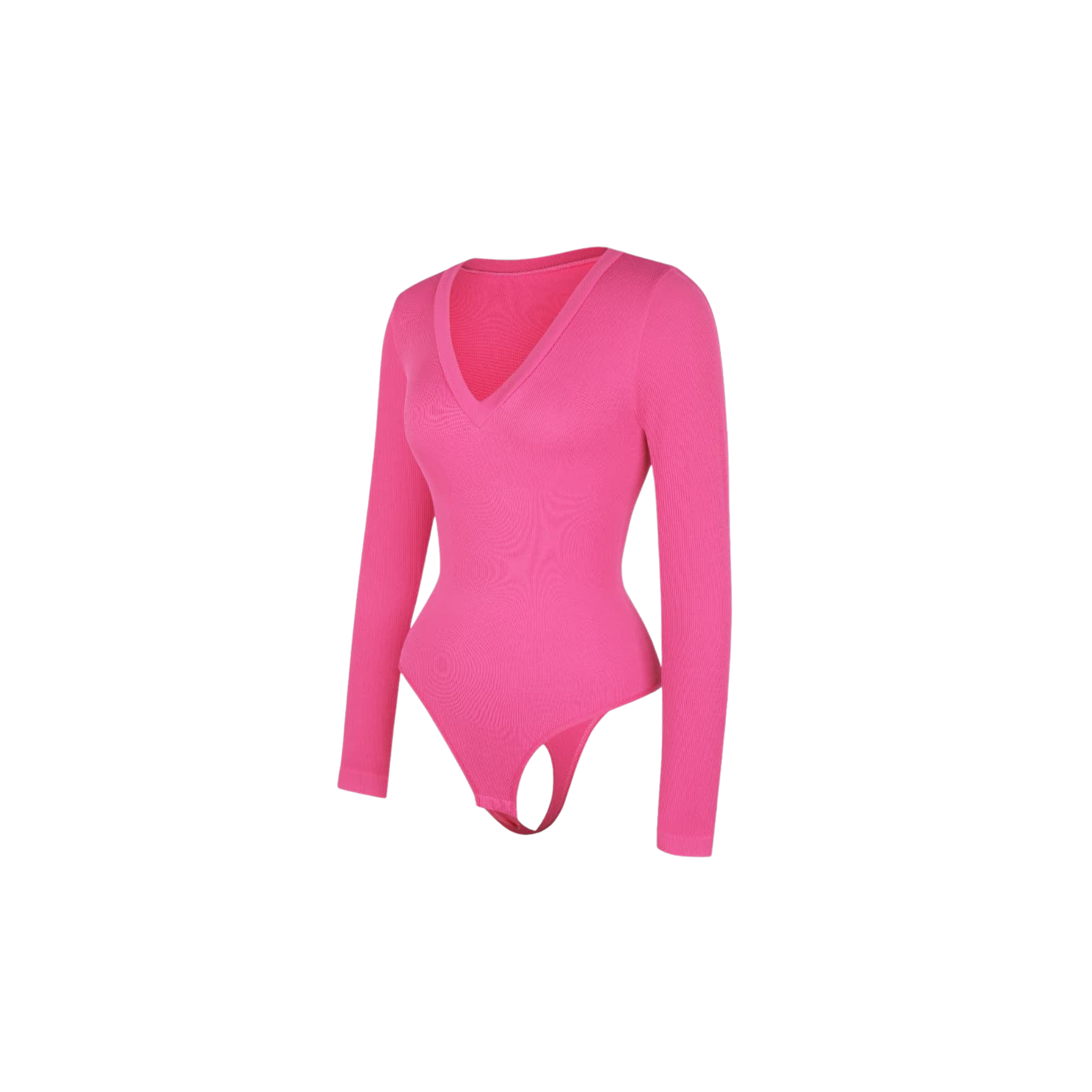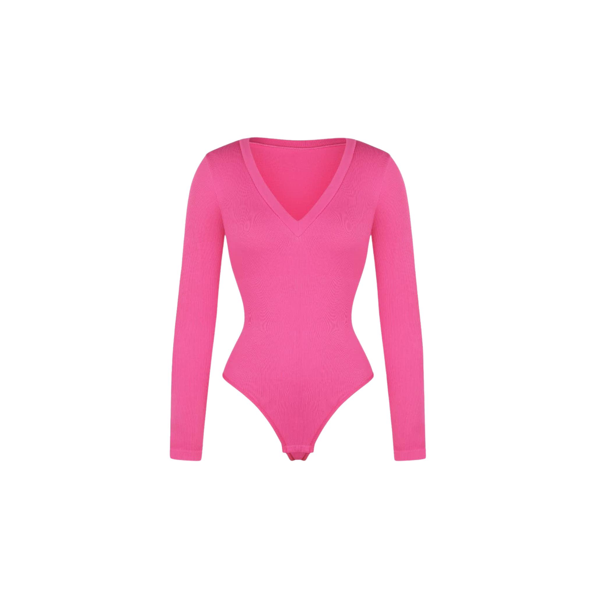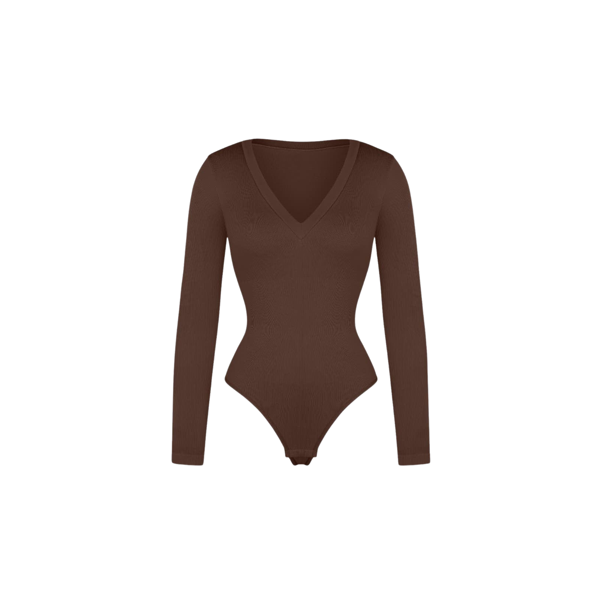 Meet your new wear-everywhere base layer. This Long Sleeve Bodysuit features a plunging V-neckline that lengthens the neckline for an effortlessly elevated silhouette. Crafted from coarse ribbed, buttery-soft fabric with high elasticity, this seamless bodysuit sculpts the waist, smooths the tummy, and subtly shapes the arms—all while keeping comfort top of mind. A thong back ensures no panty lines, and the hidden snap crotch makes changes quick and discreet. Designed to be your go-to under knits, denim, and tailoring alike.