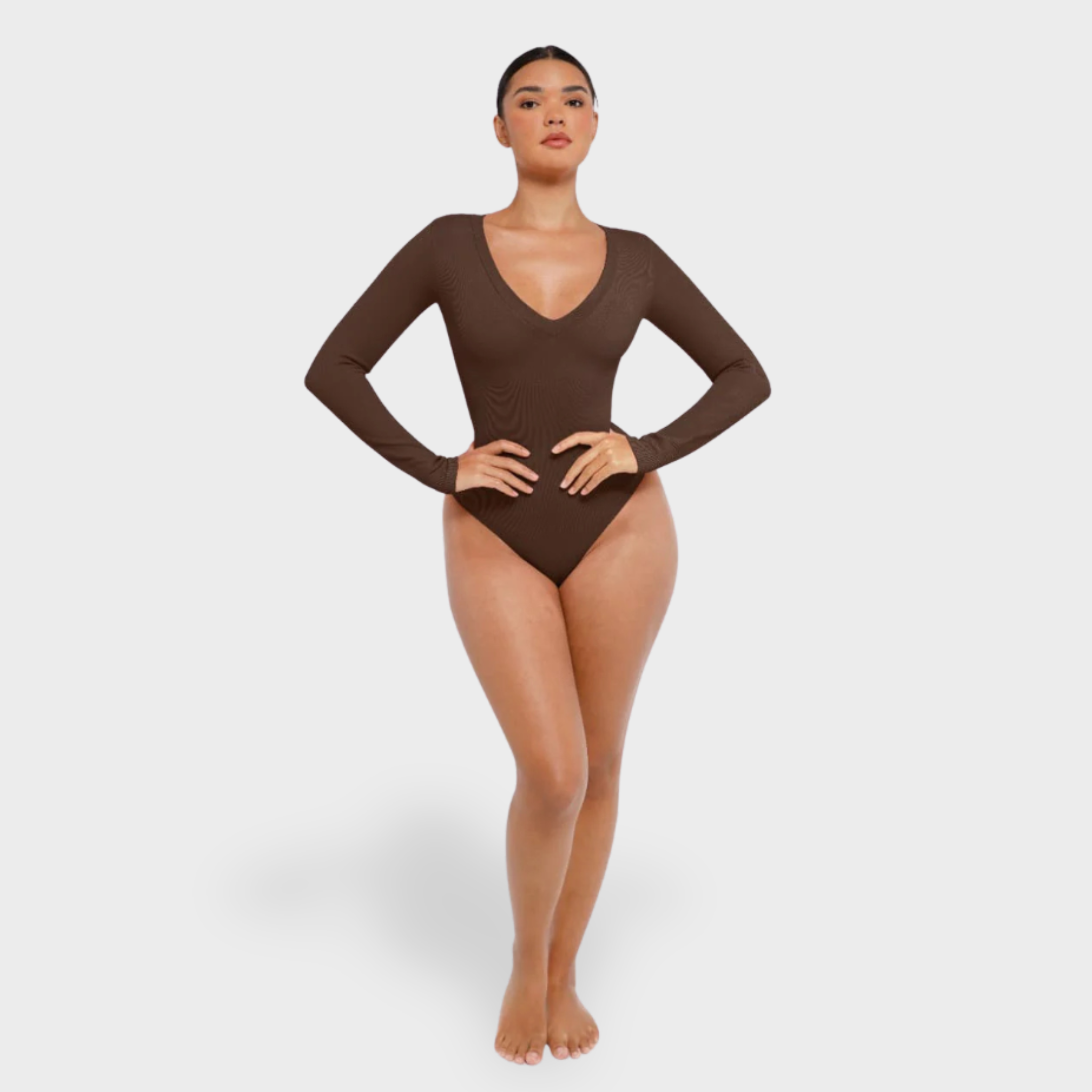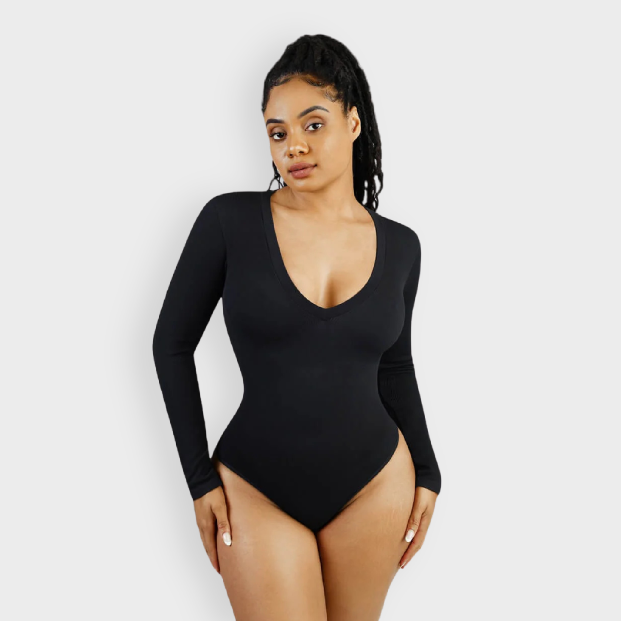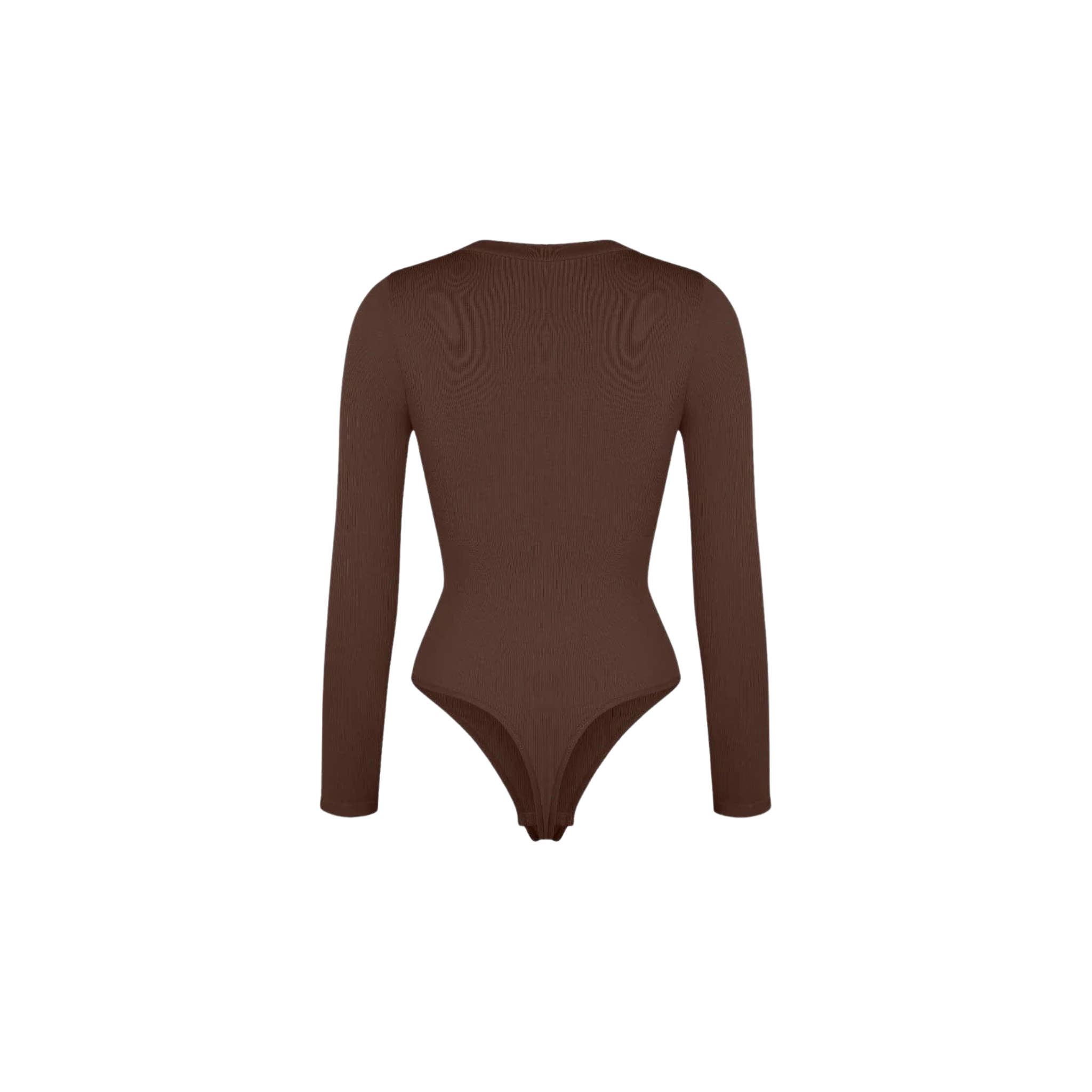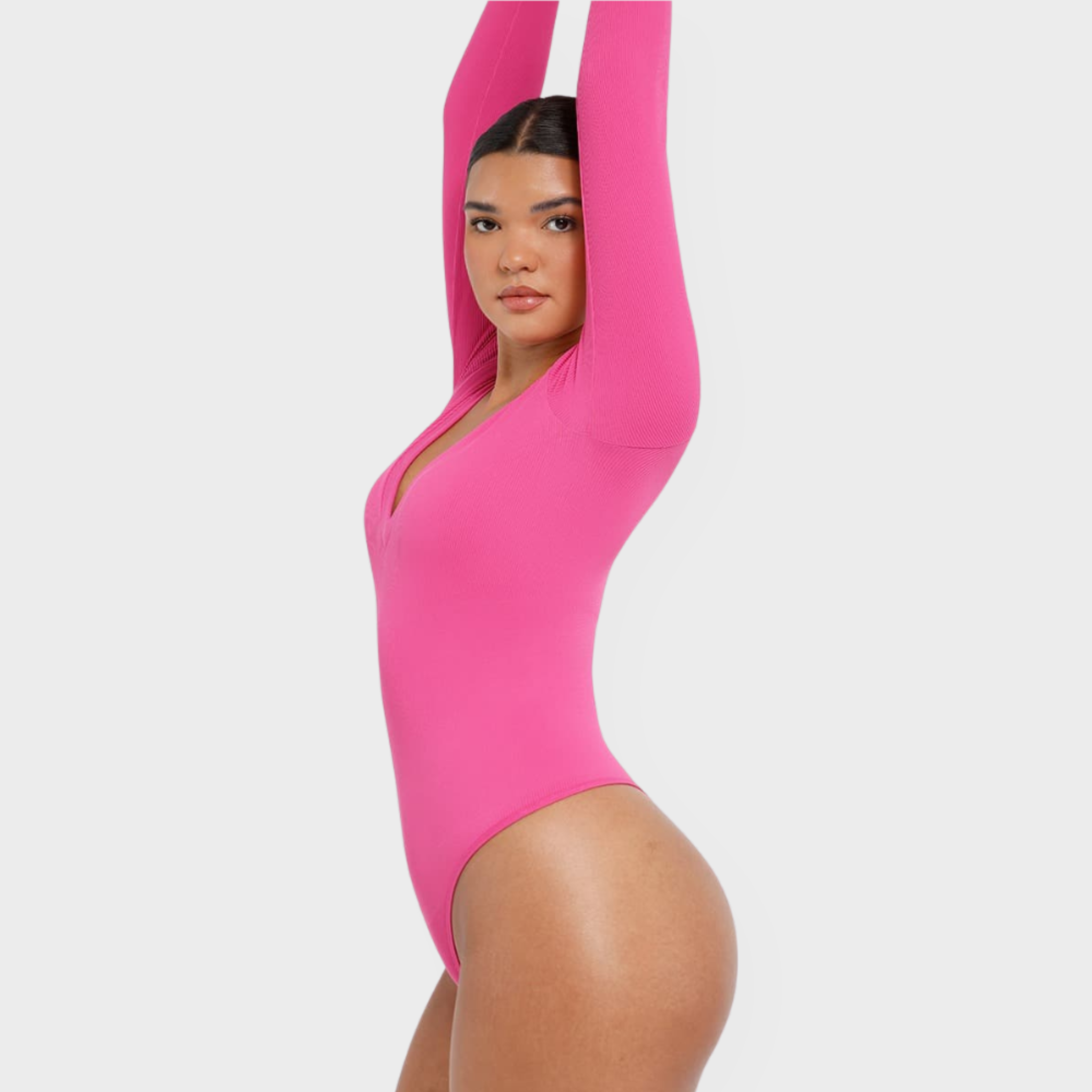 Meet your new wear-everywhere base layer. This Long Sleeve Bodysuit features a plunging V-neckline that lengthens the neckline for an effortlessly elevated silhouette. Crafted from coarse ribbed, buttery-soft fabric with high elasticity, this seamless bodysuit sculpts the waist, smooths the tummy, and subtly shapes the arms—all while keeping comfort top of mind. A thong back ensures no panty lines, and the hidden snap crotch makes changes quick and discreet. Designed to be your go-to under knits, denim, and tailoring alike.