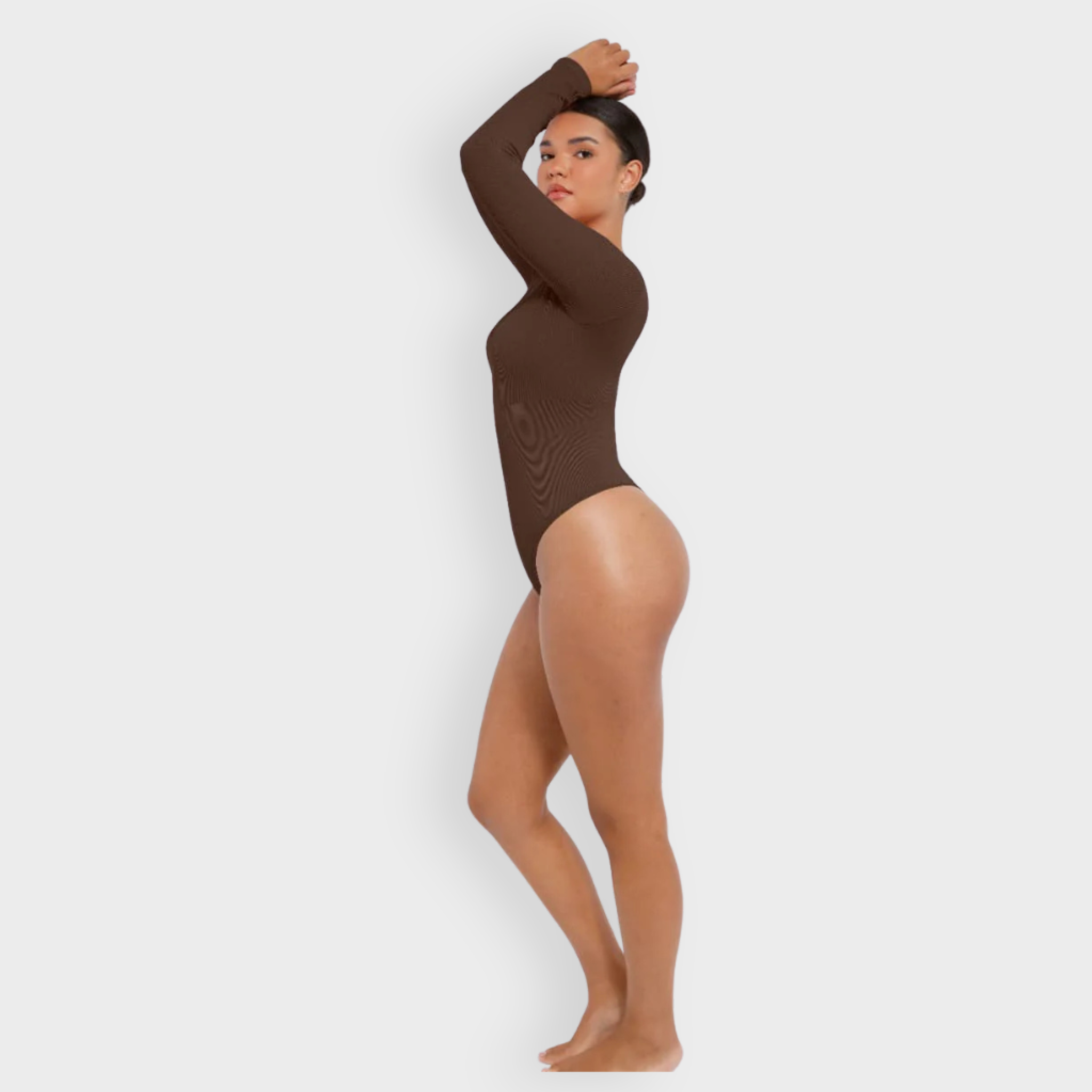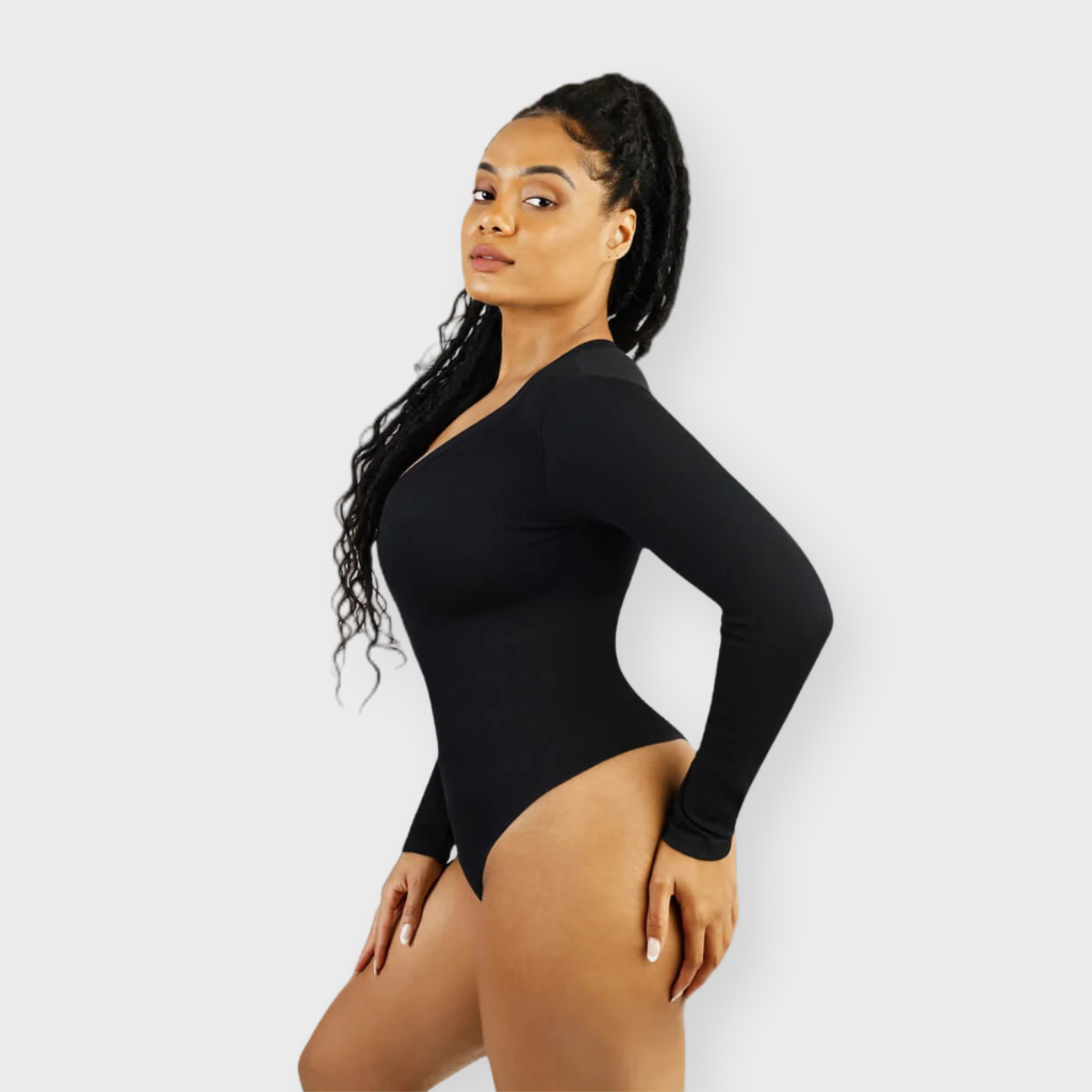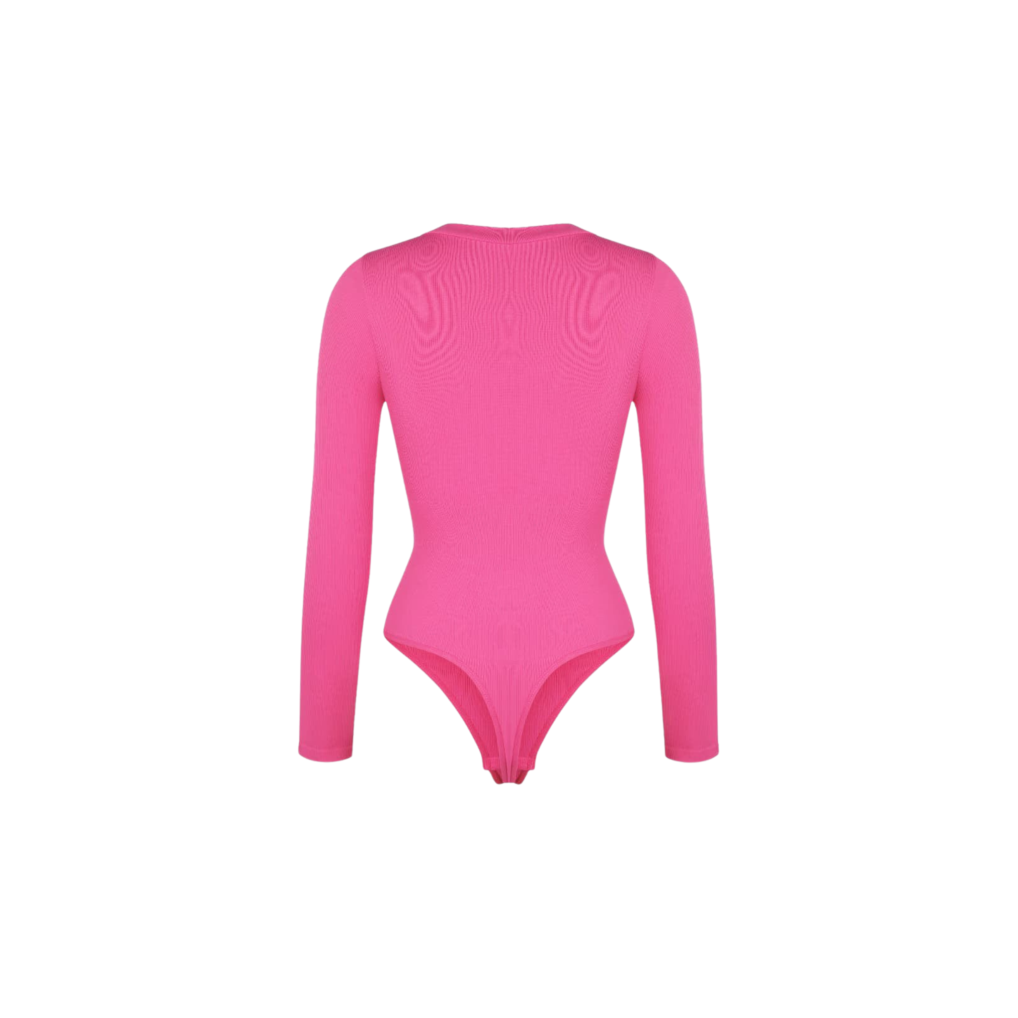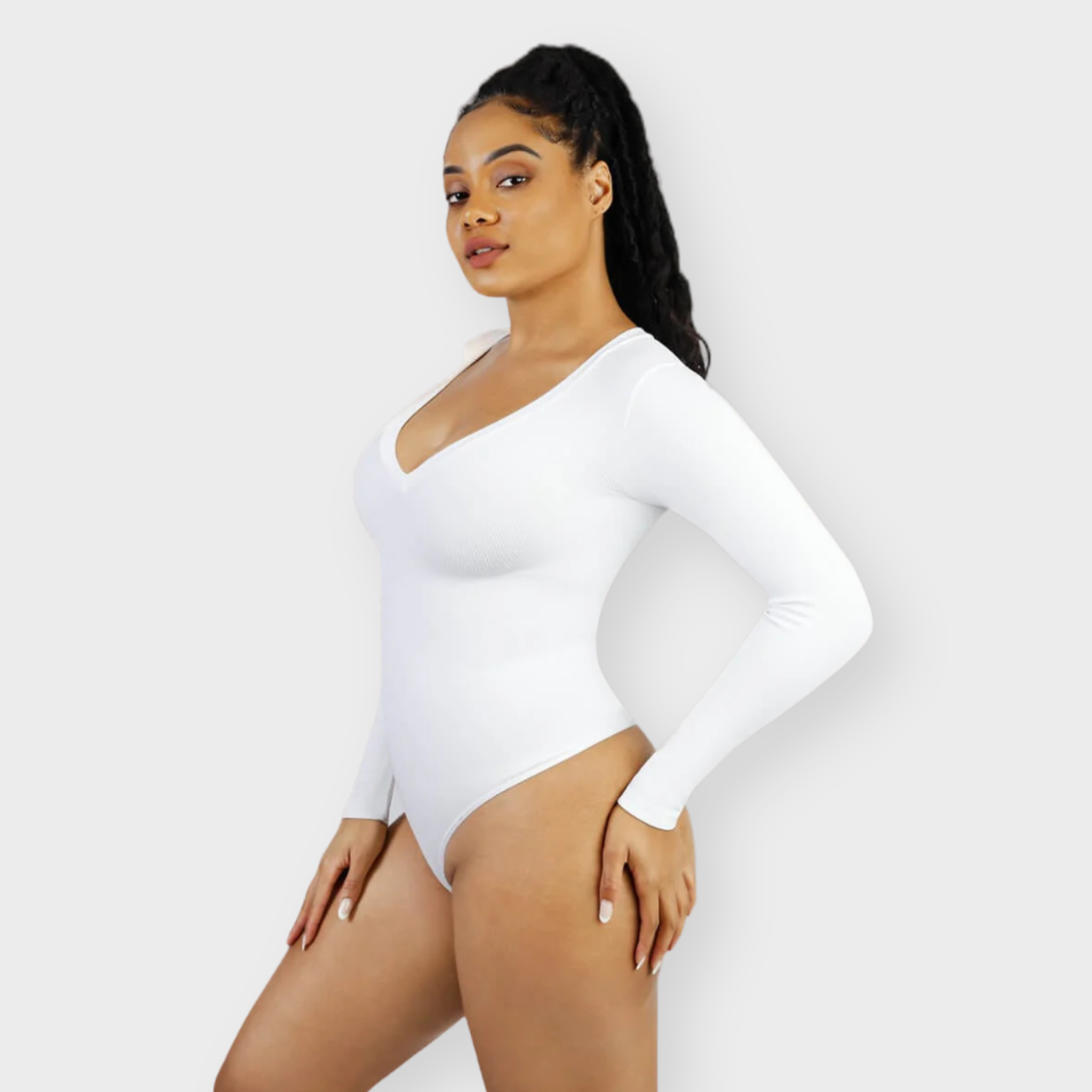 Meet your new wear-everywhere base layer. This Long Sleeve Bodysuit features a plunging V-neckline that lengthens the neckline for an effortlessly elevated silhouette. Crafted from coarse ribbed, buttery-soft fabric with high elasticity, this seamless bodysuit sculpts the waist, smooths the tummy, and subtly shapes the arms—all while keeping comfort top of mind. A thong back ensures no panty lines, and the hidden snap crotch makes changes quick and discreet. Designed to be your go-to under knits, denim, and tailoring alike.