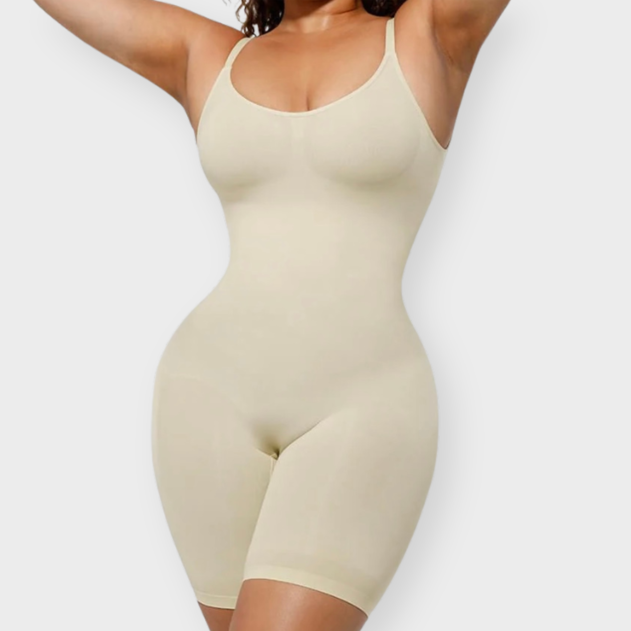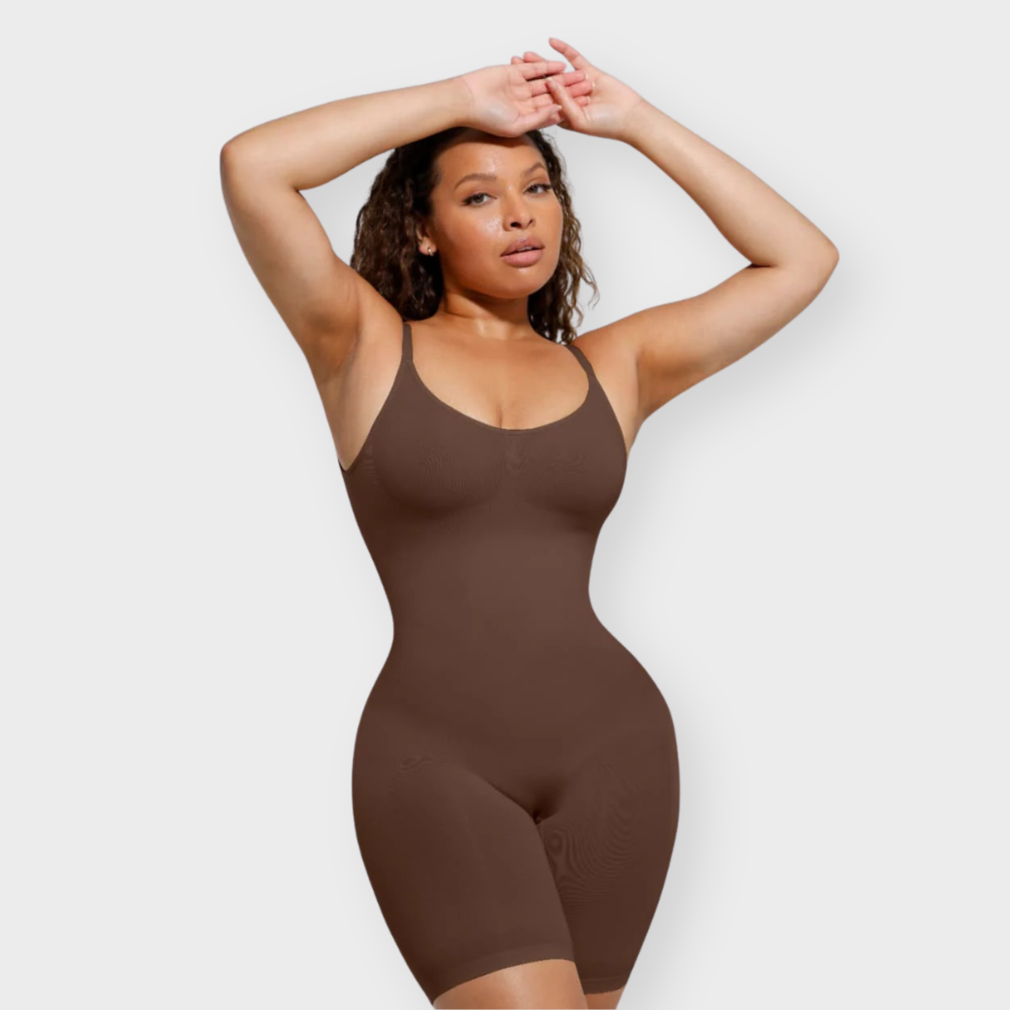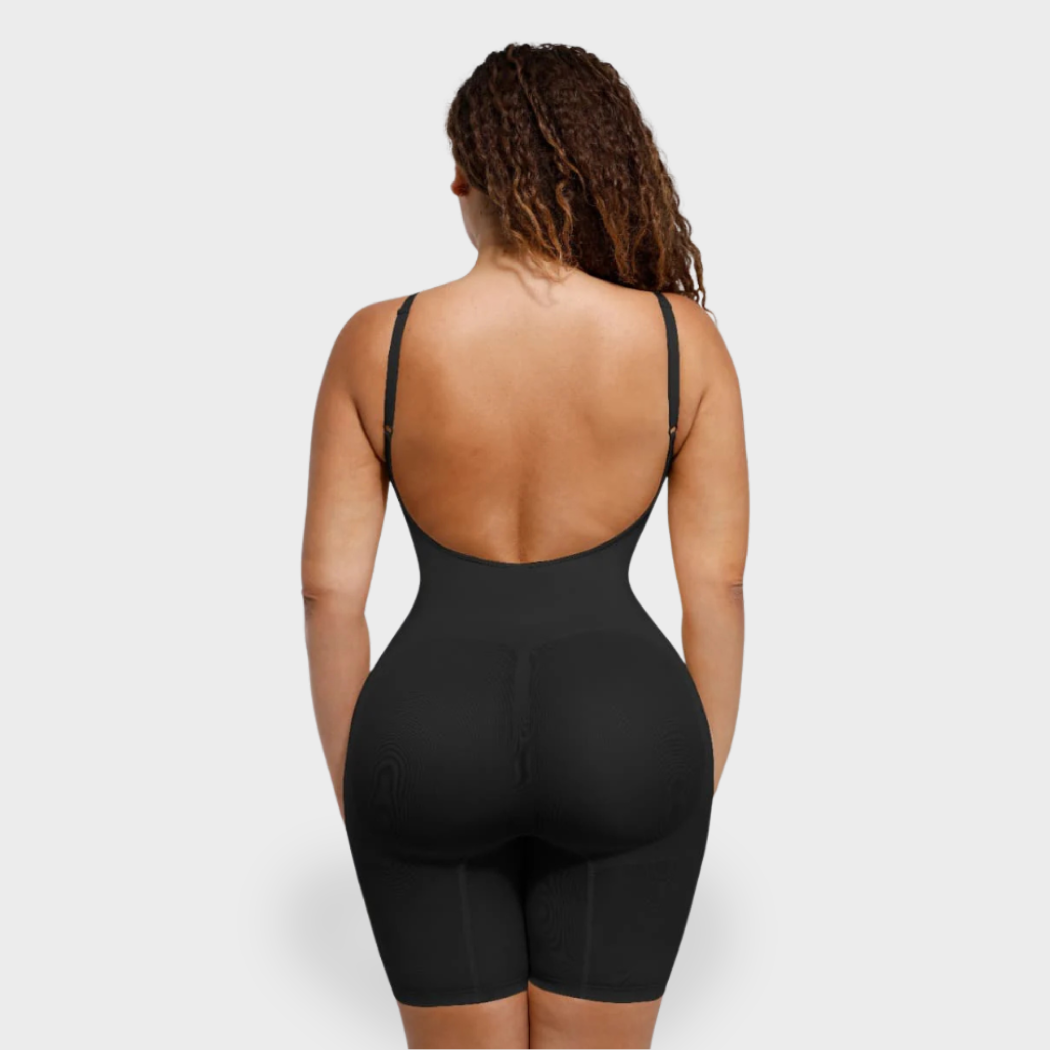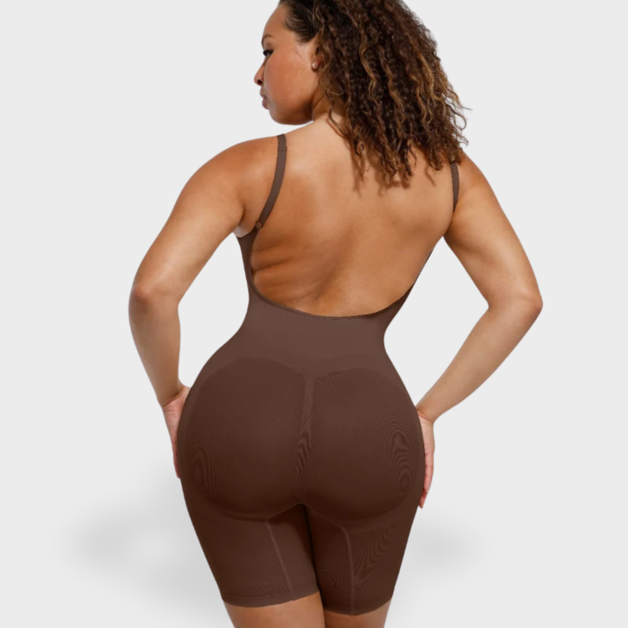 This mid-thigh bodysuit smooths and supports from chest to thigh with high-elastic fabric that flattens the abdomen, cinches the waist, and contours your curves. Designed with a low open-back and adjustable straps, it’s perfect under backless styles. Built-in underbust support offers lift without a bra, and the overlapping crotch design makes bathroom trips easy.