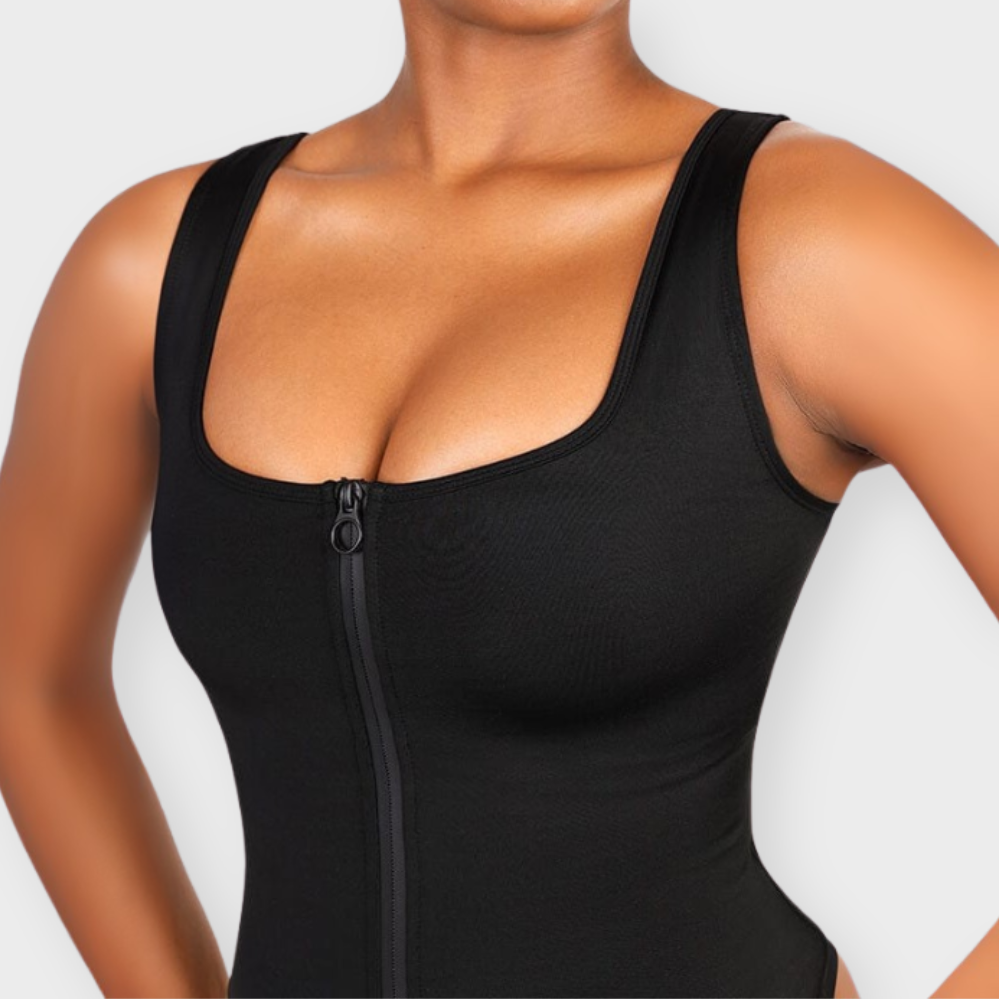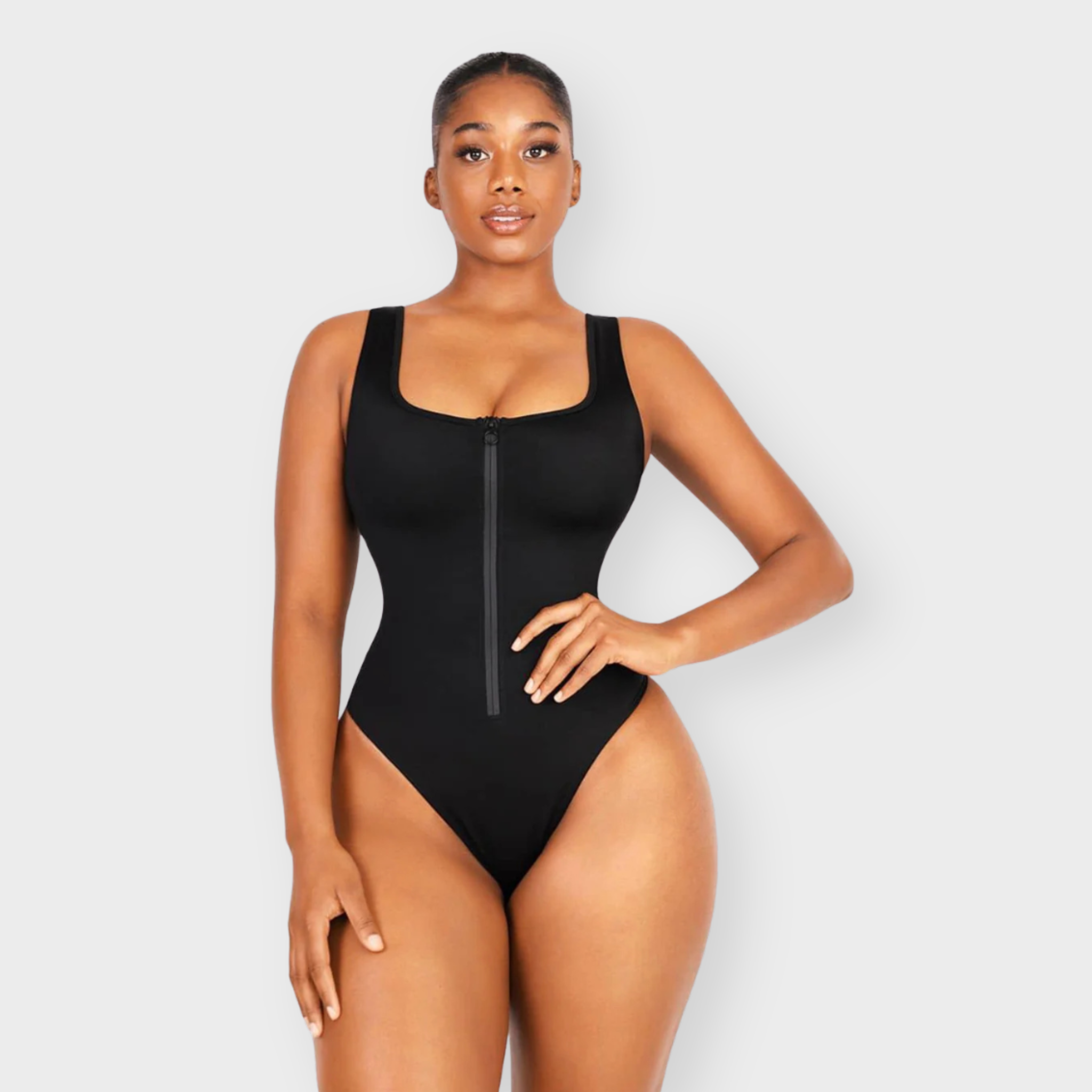 Effortless shaping meets modern design. This contouring one-piece features a waterproof zip front for easy wear and sleek styling. Built-in slimming compression and a high-cut leg opening sculpt your silhouette, while the soft, second-skin lining keeps you comfortable from poolside to seaside. Designed to smooth, support, and move with you.