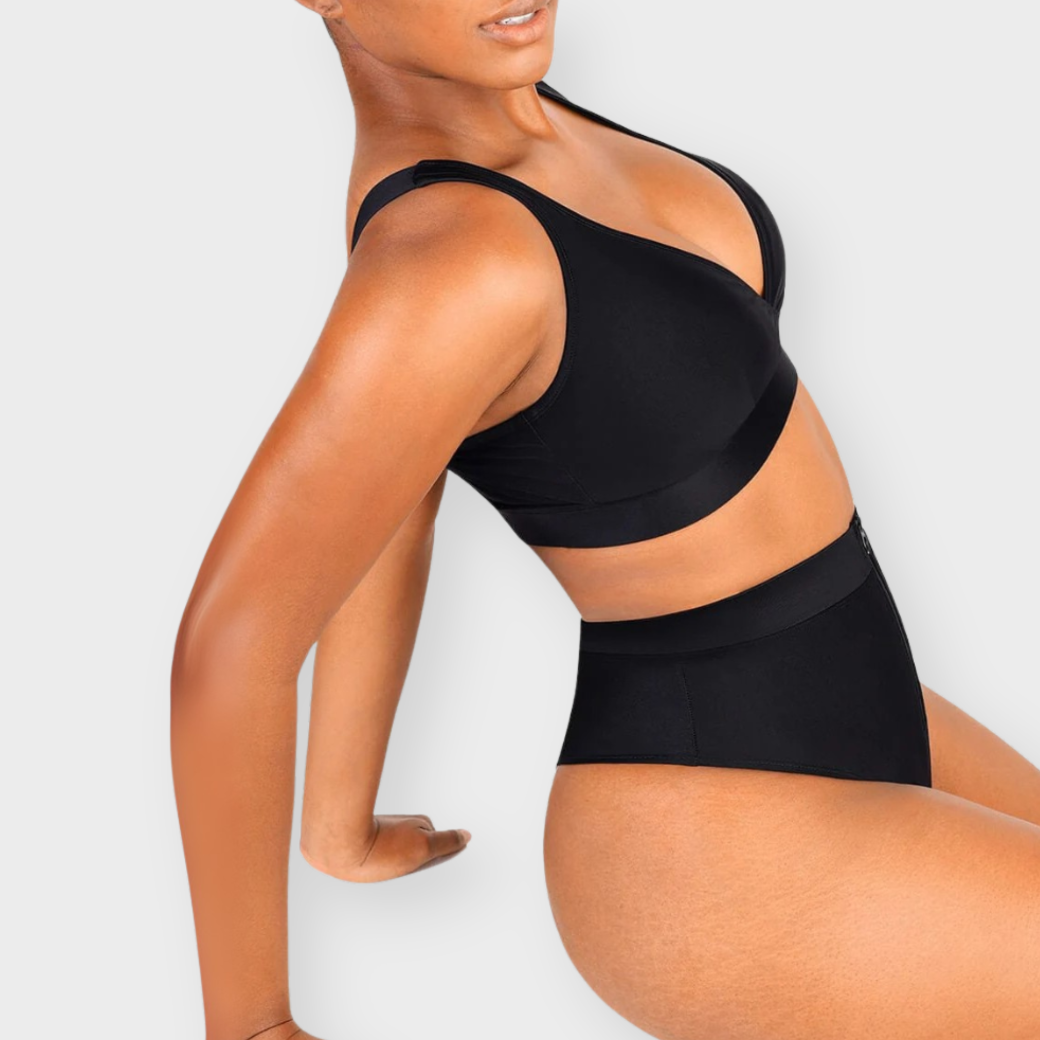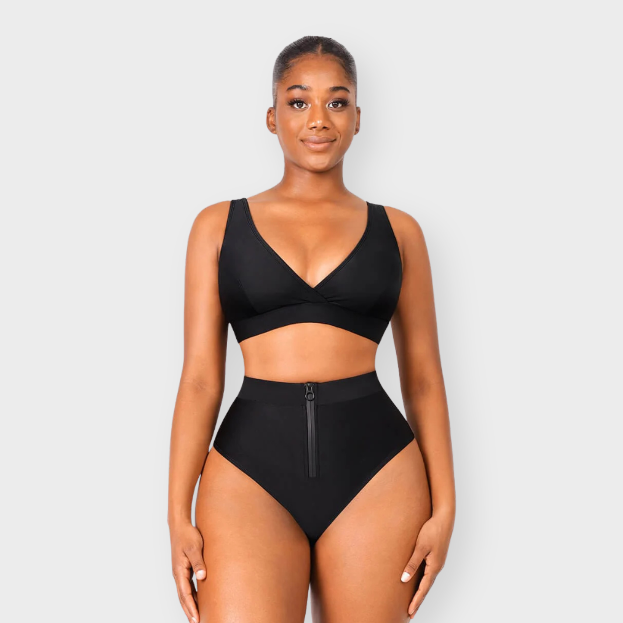 Where sleek support meets effortless style. This sculpting bikini set features a surplice neckline top with adjustable straps and removable cups for a customizable, flattering fit. The matching high-waist bottoms are designed with a waterproof zip front and built-in tummy control that smooths and contours without compromising comfort. With second-skin lining and sculpting fabric throughout, this set moves with you and supports every curve—so you feel confident, secure, and effortlessly elevated.
