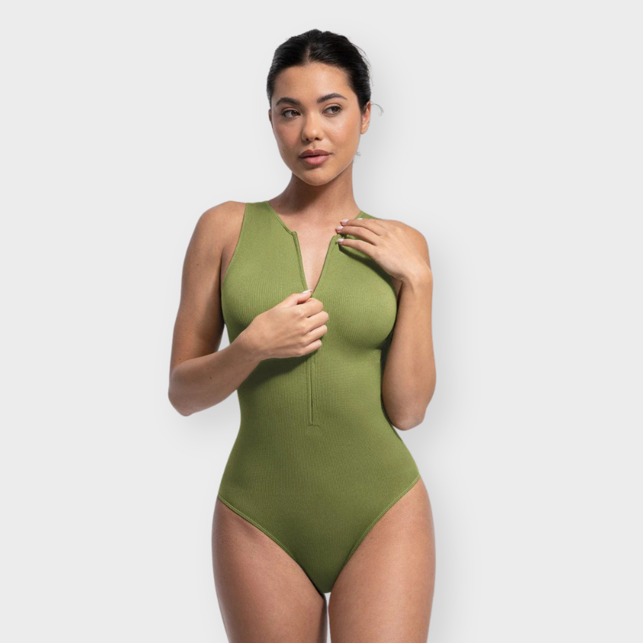 This ribbed, zip-front bodysuit blends everyday style with subtle shaping power. Designed with a classic crew neckline, seamless construction, and a hidden zipper, it offers breathable compression that hugs your curves in all the right places. Perfect for layering or wearing solo, it’s finished with a soft triangle brief cut and snap closure for effortless all-day comfort.